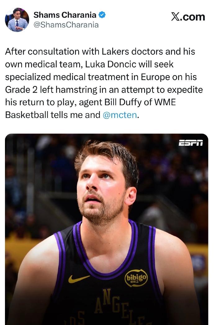 东契奇还想着快速复出呢? 根据shams报道,东契奇将前往欧洲,针对自己的二级左腿筋拉伤接受专项医疗治疗,以期加速康复、尽快回归赛场。 这个专项治疗,医学专家Evan Jeffries进行了曝光。 基本治疗是“干细胞”移植,还有辅助治疗,是美国不允许的一些方式。这会缩短一半的伤愈周期,但可能带来一些潜在的损伤。 这意味着如果治疗得当,东契奇只需要2-3周时间就可以复出。 但这真的没有必要了,即便东契奇复出,里夫斯也复出,全员健康,湖人也就是个二轮的实力,想要进西决,都需要泼天的气运才行。 湖人下赛季的阵容会大幅度调整,詹姆斯、八村塁、艾顿等人都有可能离队,未来才是真正围绕东契奇建队的关键时期,完全没必要为了这赛季透支潜力。 退一步讲,对湖人这样的队伍而言,止步首轮和止步二轮,没有区别,为了多打一轮比赛紧急复出,实在得不偿失。