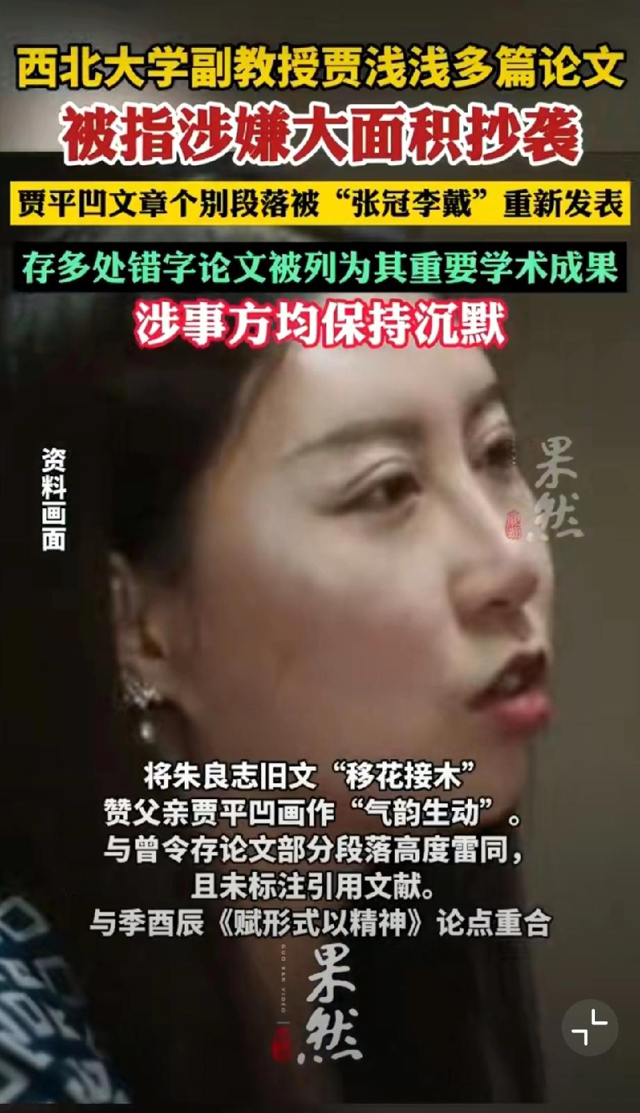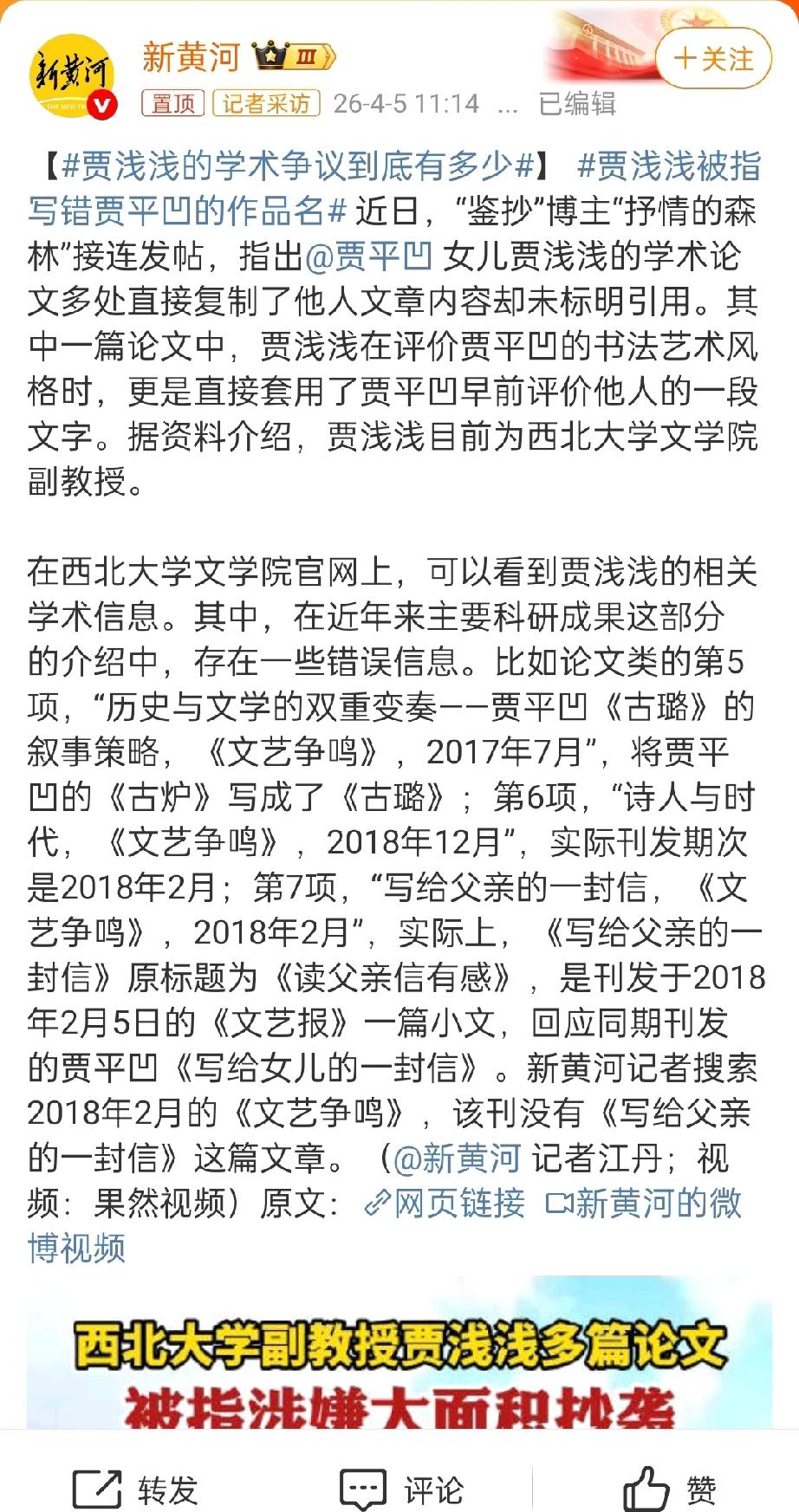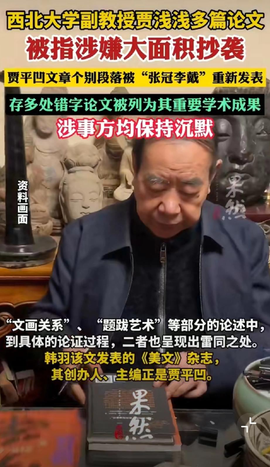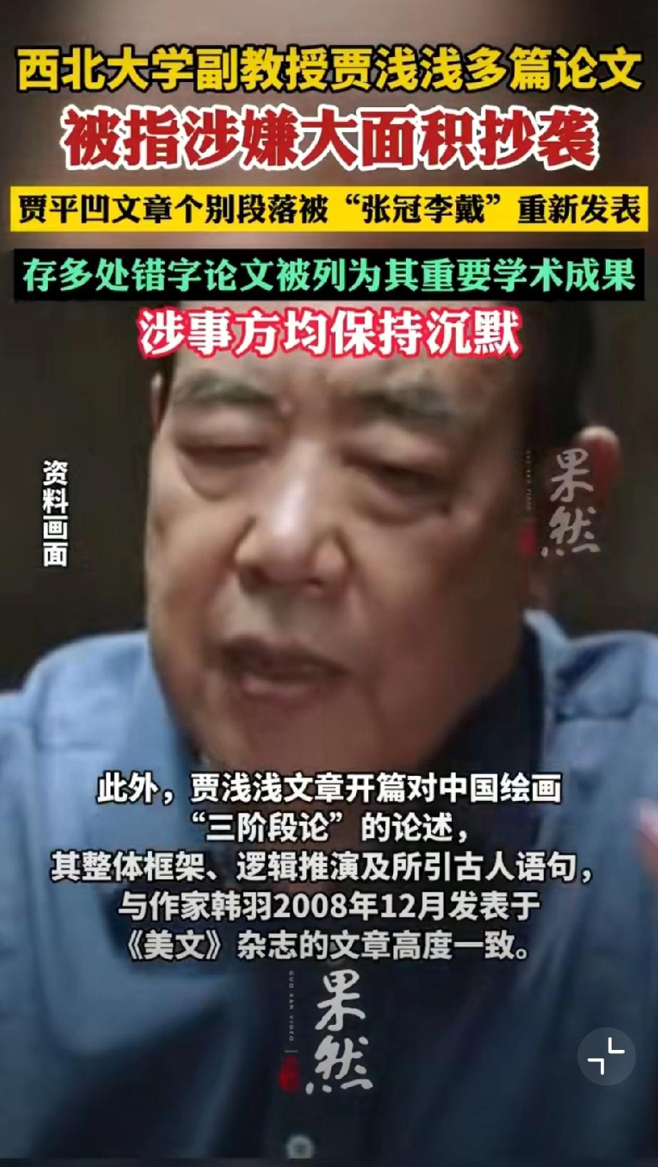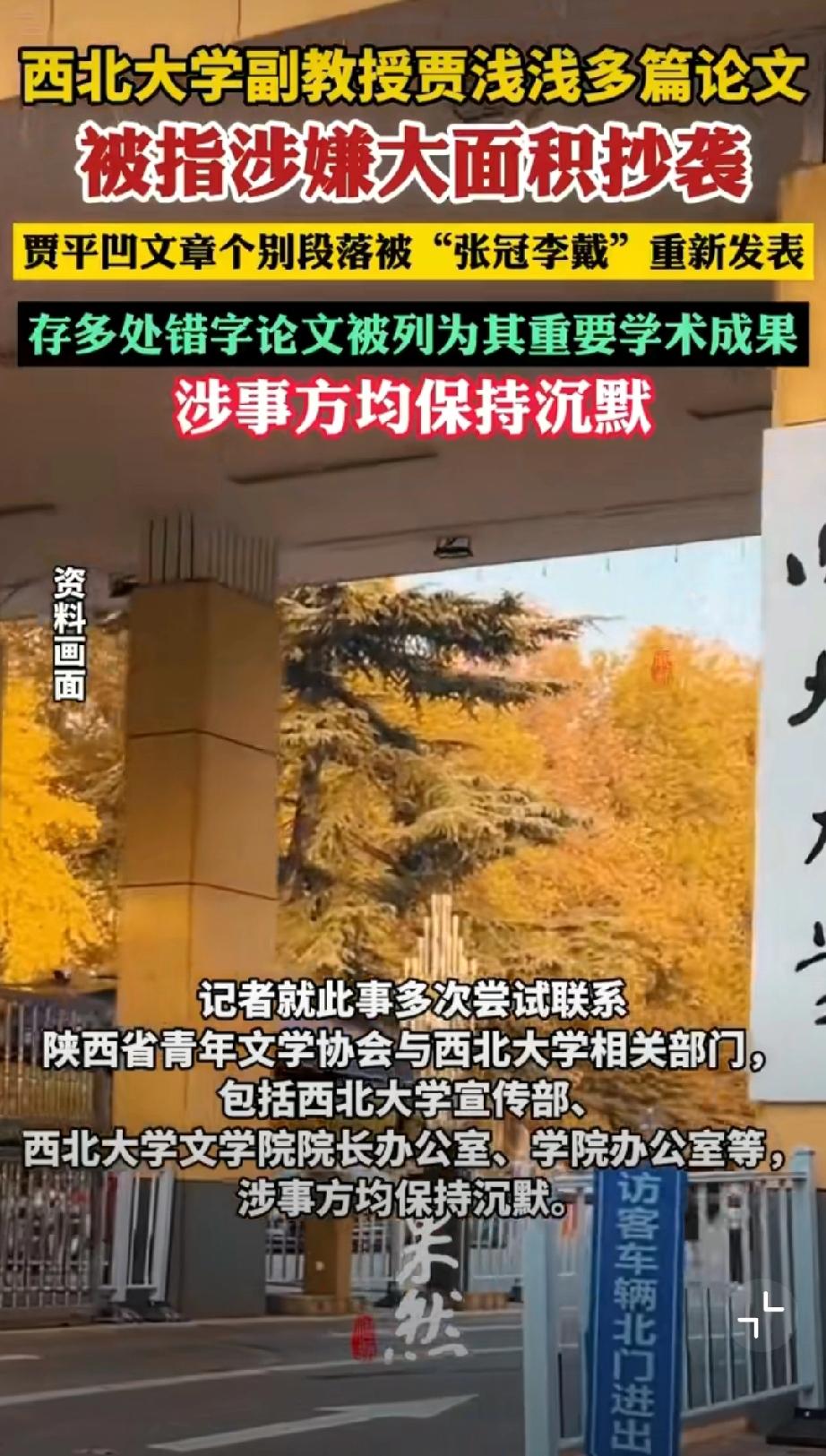 沉默不是回应!贾浅浅被指涉嫌抄袭后:贾平凹和贾浅浅父女沉默、作协沉默、出版社沉默、书评人沉默、贾浅浅工作的单位西安建筑科技大学、西北大学沉默……所有的利益相关者,全都在沉默。 他们一个圈子的人都在试图用沉默抵抗舆论,用不回应让大众逐渐遗忘这件不光彩事,更想着有更大的热点事件出现,压下公众对贾浅浅的讨伐。 其实,贾浅浅文学水平被质疑,不是第一次了。 很早之前就被爆出她的诗歌水平低下、低俗,可是无人在意;后面被爆出她的本科学历有问题,进入西安建筑科技大学当老师,似乎也不符合人才引进要求,是她爸爸贾平凹在背后使力。 但“父母托举女儿”大家议论议论也就过去了。 没有想到,几年过去了,贾浅浅无论是文学水平、还是教学水平、业务能力都没有提升,发表论文还是“抄父亲、抄大作家”,依然把“学术场当作家学场”。 写作能力没有提升,造假手段倒是高明不少。 但贾浅浅这个事情,相关的涉事方没有一个出来回应的,都不敢冒头管这件事,都怕被沾上后,被扒出来更多不堪的交易和内幕。 公众的质疑就这样被彻底无视,但学术场不是家学场,他们该给公众一个负责任的答案。贾平凹抄袭 贾教授争议 仿家浅浅的诗
