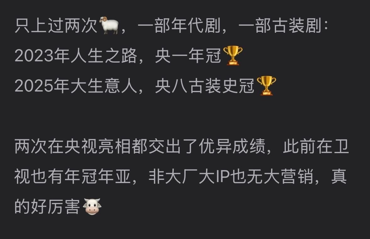 woc陈晓 实绩是真的🐮85扛剧生早就毋庸置疑了吧?平时不声不响低低调调地拍戏,结果每次都带来优秀的答卷惊艳所有人!从早些年的陆贞传奇再到去年的大生意人,十多年间给观众创造了多少经典作品、鲜活角色与高光名场面啊。两次上🐑都创下极好成绩,人生之路是当时的央一年冠,大生意人打破了央八破三的纪录。一出手就是稳稳的很安心🥹演技好收视好口碑好,接下来斩获视帝提名和奖项荣耀应该也不是什么出奇的事吧!
