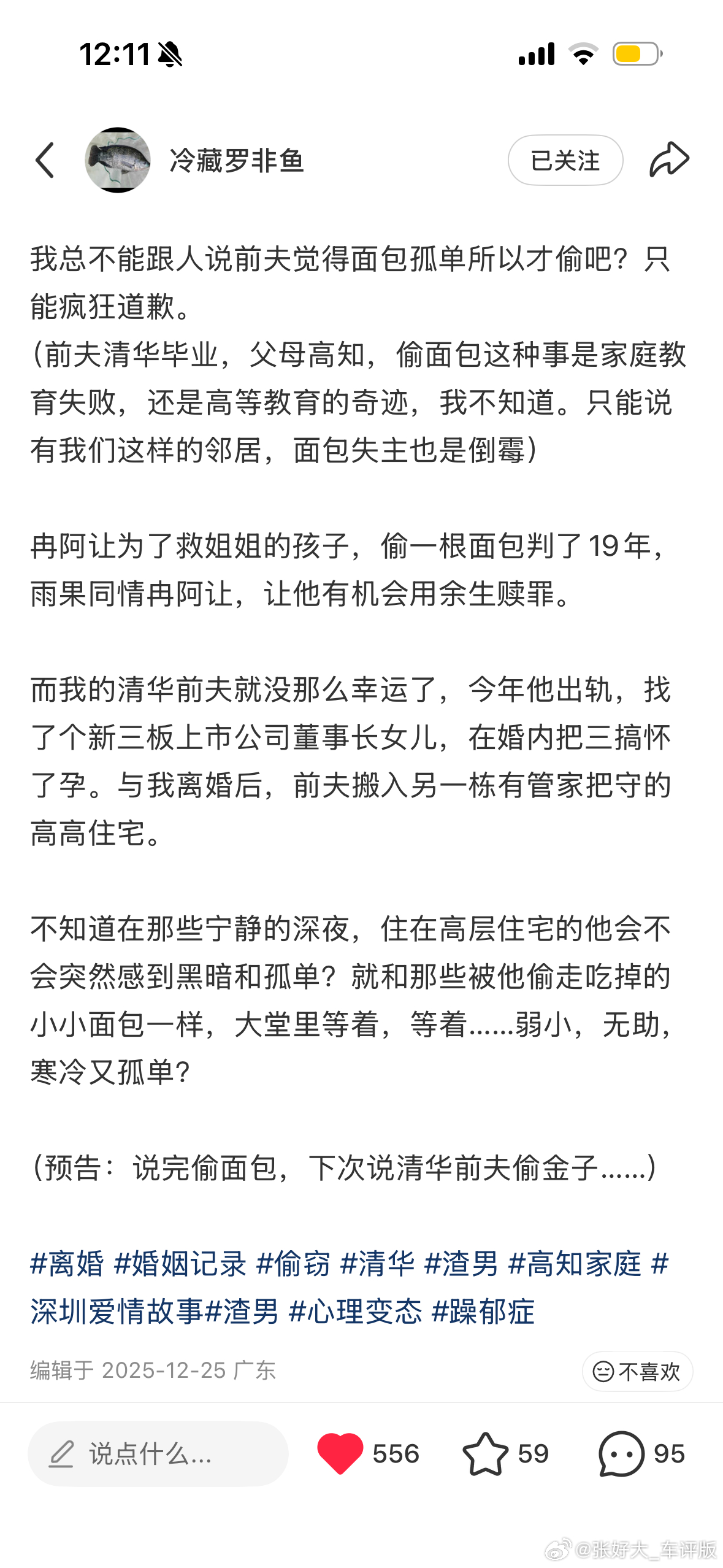 说实话,看到博主讲前夫出轨、给3️⃣当赘婿、和3️⃣生孩子、偷她金子、坑她300万我都没啥感觉。太阳底下没有新鲜事,陈世美而已嘛。直至发现博主的微博大号其实是某位和我互关的美女科幻作家时,我也只是感叹高质量人类怎么也要吃这种苦。