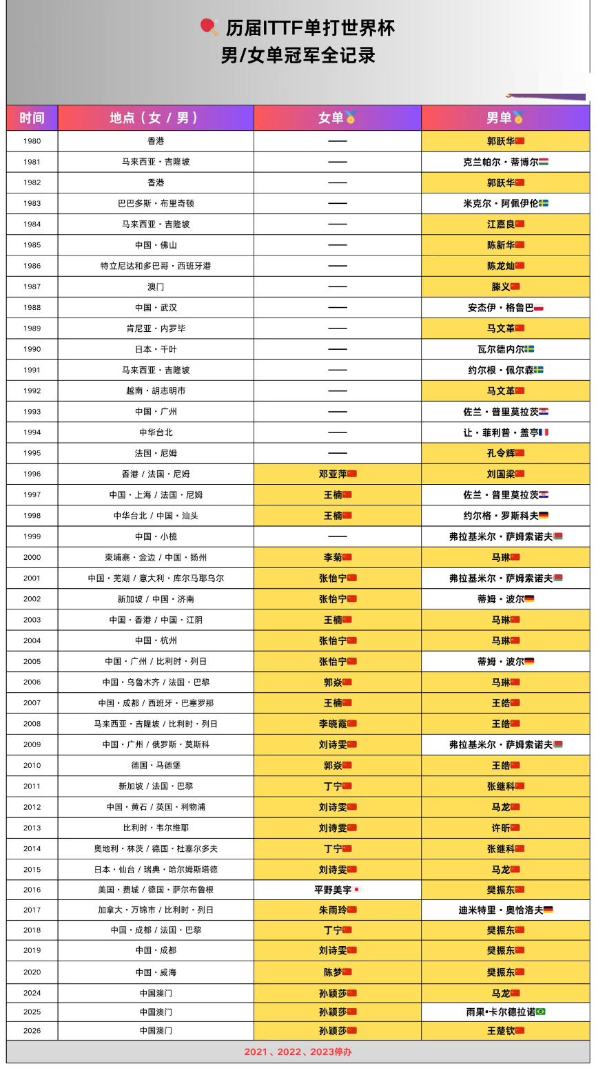 历届ITTF单打世界杯男女单打冠军全记录 恭喜孙颖莎成为历史上首位达成世界杯三连冠的女运动员! 恭喜王楚钦夺得个人职业生涯 首个世界杯男单冠军! 获得世界杯单打冠军次数最多的是 刘诗雯,共获得5次! 王楠,张怡宁,马琳,樊振东各获得4次世界杯冠军! 丁宁,萨姆索诺夫,王皓,马龙, 孙颖莎各获得3次世界杯冠军! 波尔,郭焱,郭跃华,马文革, 佐兰,张继科各获得2次! 有人质疑2022年新乡为什么不是世界杯? 那一届叫WTTcup Finals Xinxiang 2022,那三年ITTF世界杯停办了, 只能说是当时的赛事体系有点混乱! 有点像WTT年终总决赛的样子!