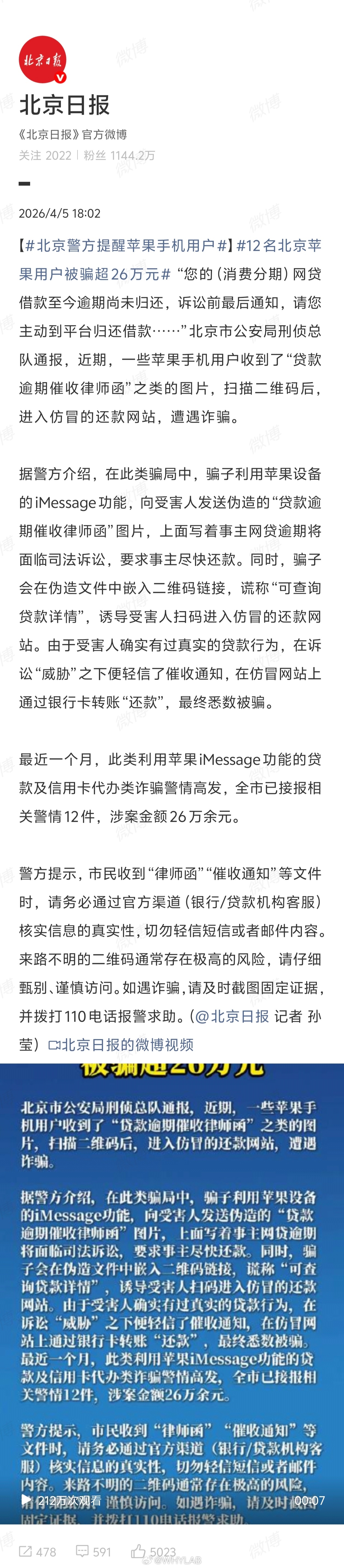 北京警方提醒苹果手机用户已经有十二名北京苹果用户被骗超 26 万元,你们就记住,来历不明的二维码、链接和短信不要信,也不要扫,更不要点进去。