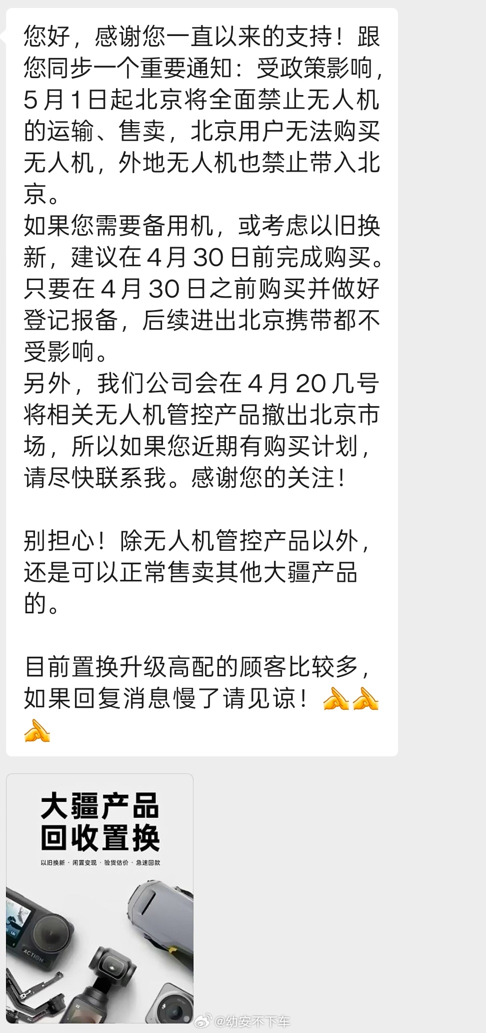 大疆门店的销售给我发来的消息,5月1号之后,北京开始实施管控,大疆门店4月20几号将相关无人机管控产品撤出北京市场。我手上现在三个无人机,回去就全都登记以后要想飞无人机只能去北京之外。我最近在考虑用360代替无人机的视角,感觉在北京更实用。我的日常plog幼安唠嗑