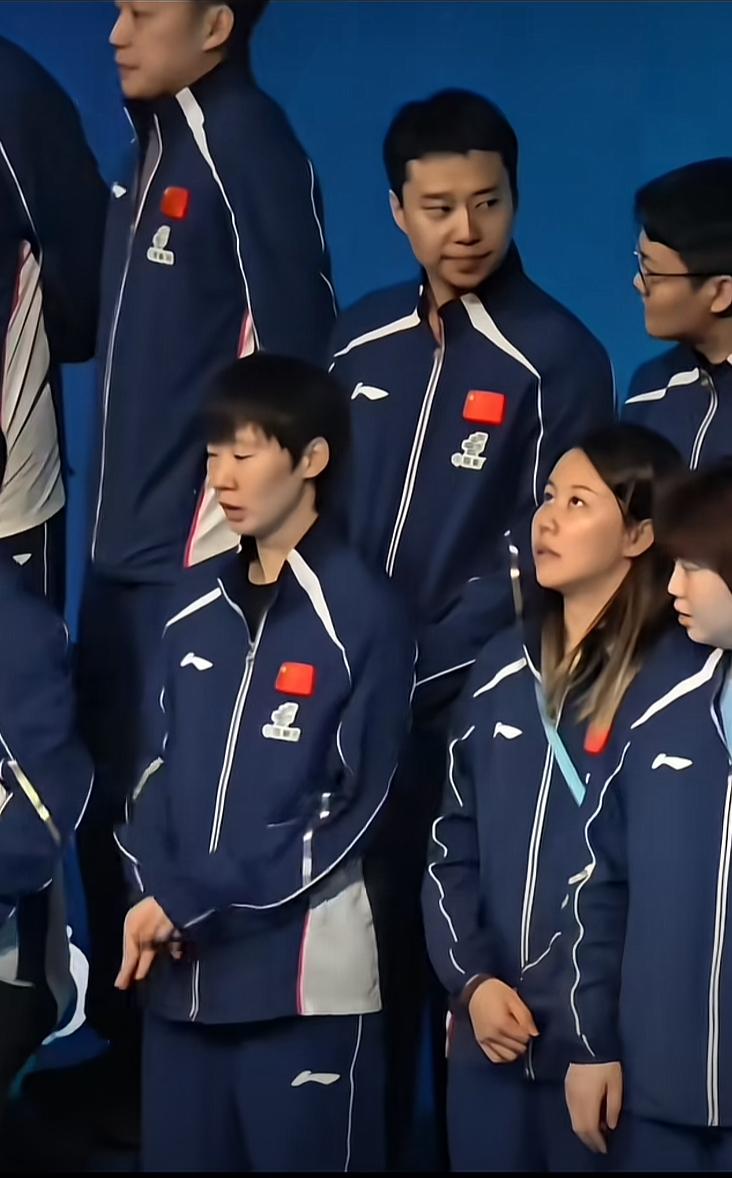 王曼昱不但让陈幸同下来, 还手掐腰, 陈幸同不下来。 最后还是被拉了下来, 蒯曼在旁边看着, 好像吃瓜群众。 原来是国乒大合照, 陈幸同披着头发过来, 真的很漂亮。 来到王曼昱旁边, 高了很多, 她还站在台阶上。 王曼昱知道正确的位置, 让她下来, 笑不活了, 刚开始还不下来, 最后被2个人拉了下来。 两人不愧是好队友, 一起的画面真和谐。 王曼昱后边是孙颖莎, 应该是按照排名站位!