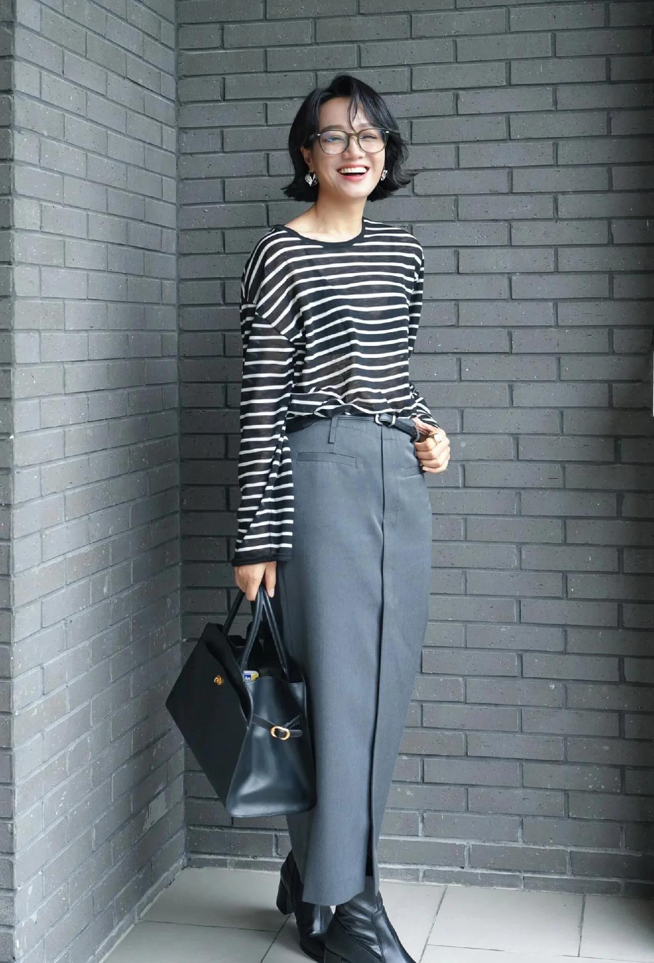 朱丹这套通勤穿搭,普通姐妹直接抄!条纹衫+开叉半裙,遮肉显瘦又提气质 通勤穿搭 显瘦穿搭 朱丹同款