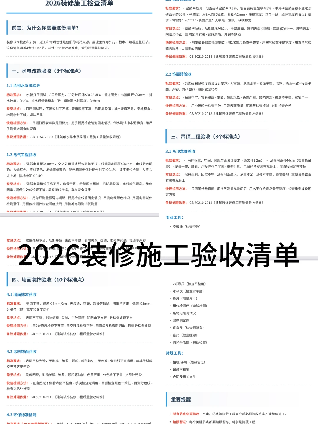 装修施工阶段,我见过太多业主返工返到哭。 上个月一个邻居,贴砖返工3万、水电返工2万,最后超预算10万+🥹 原因?都是这些不起眼的细节坑了 今天把10个最常见的施工坑写出来 装修前一定要看,看完能省3-8万!!! ——— ⚠️【为什么这些坑没人告诉你?】 因为装修公司按面积计费 返工反而是他们的利润来源 而业主作为外行,根本不知道这些细节 所以我写了这份【👉🏻2026装修施工检查清单】 包含水电、贴砖、吊顶、墙面4大环节,共计35个验收标准点,拿着这份清单去验收,装修公司不敢坑你