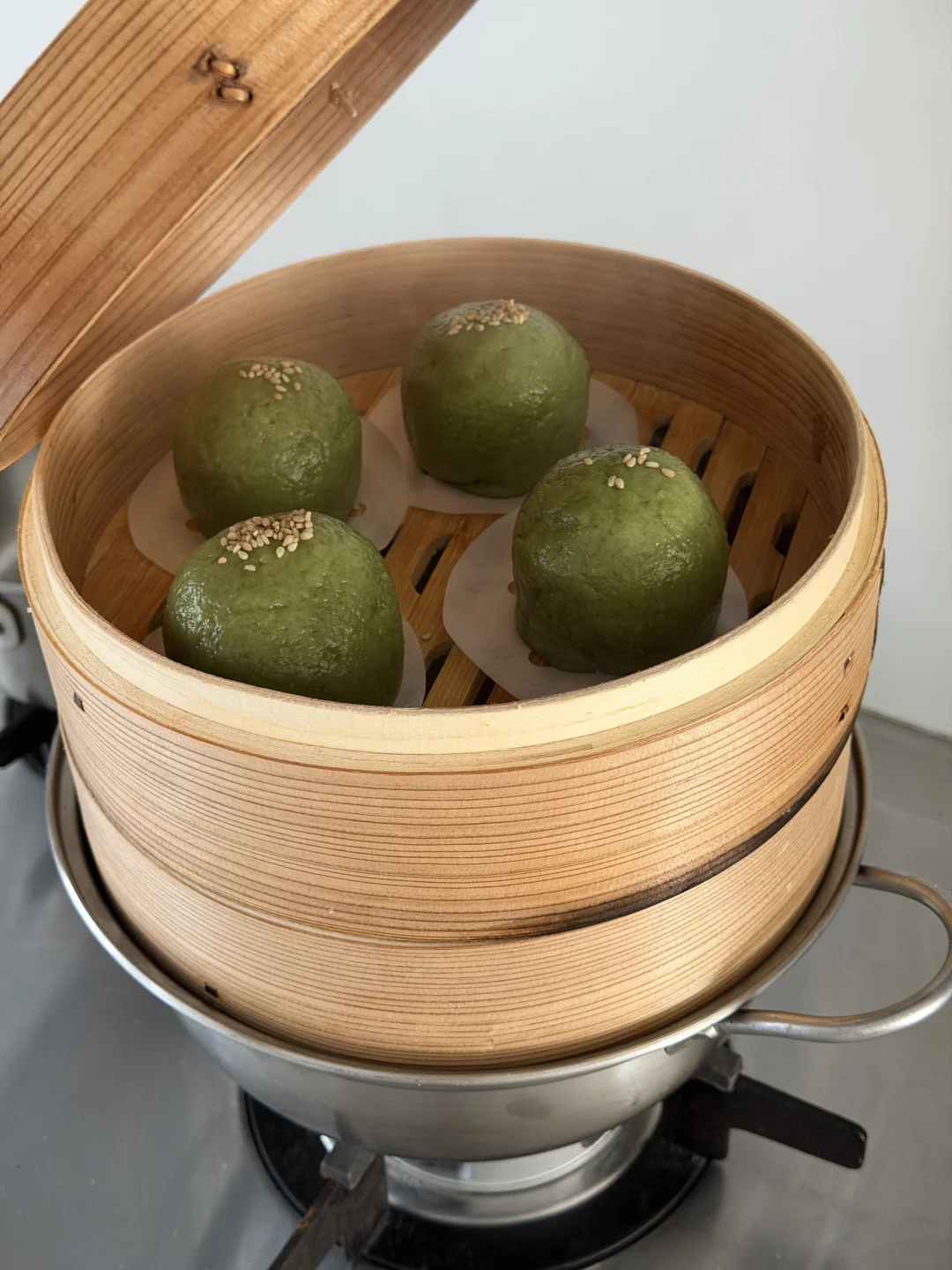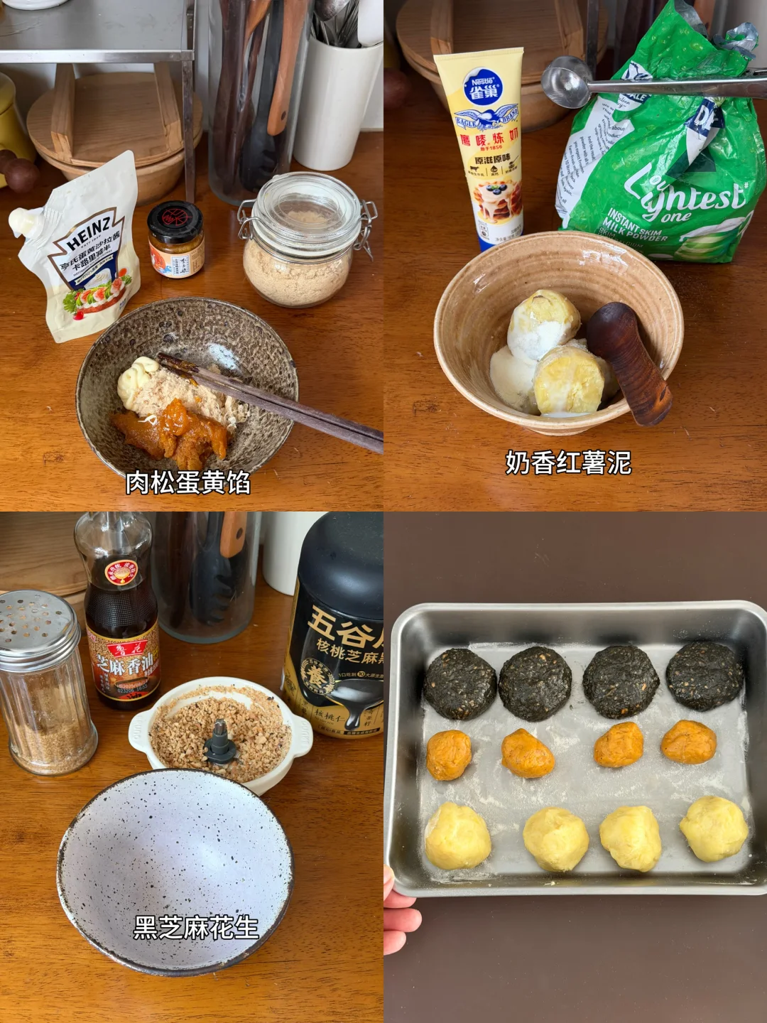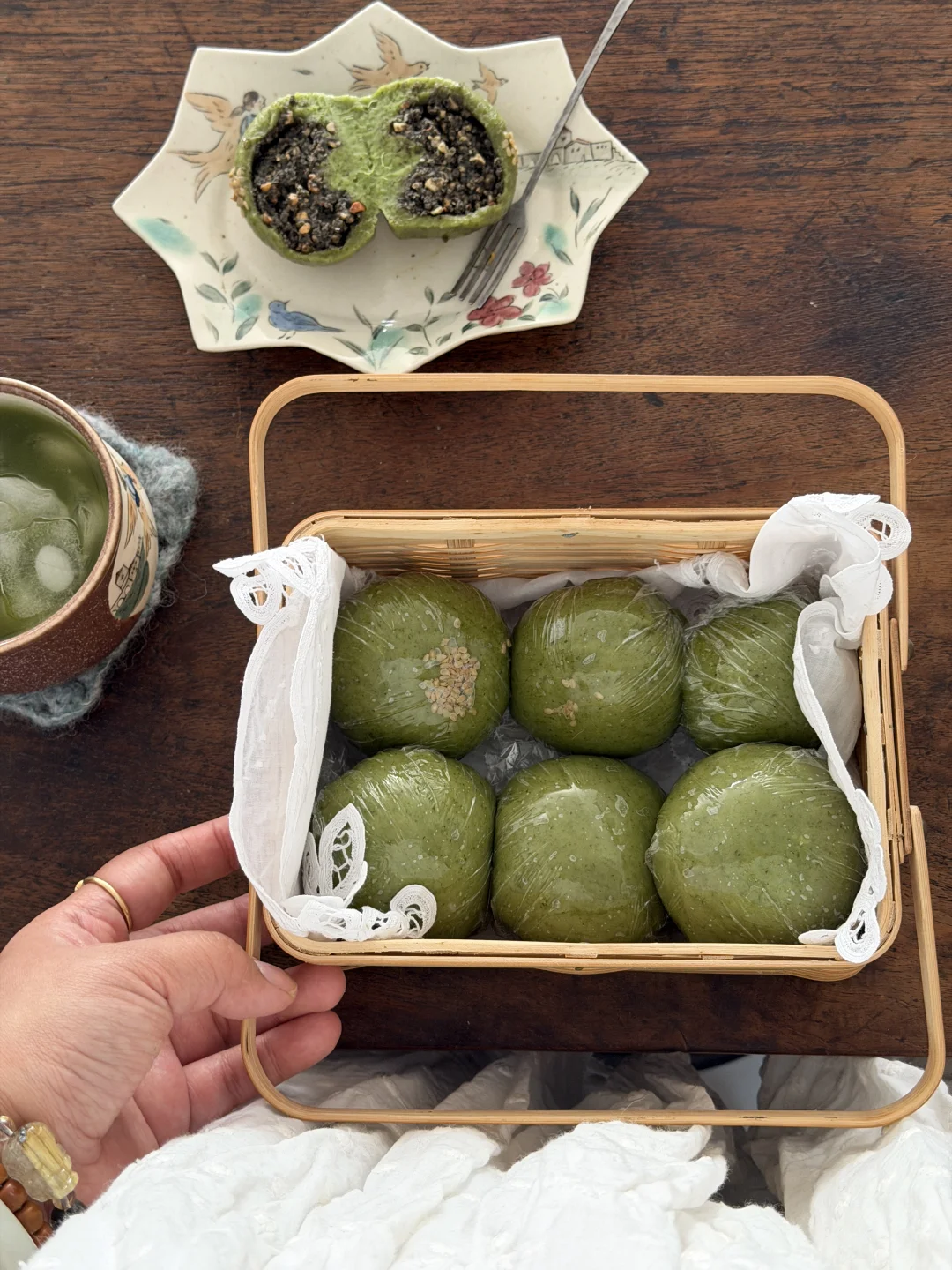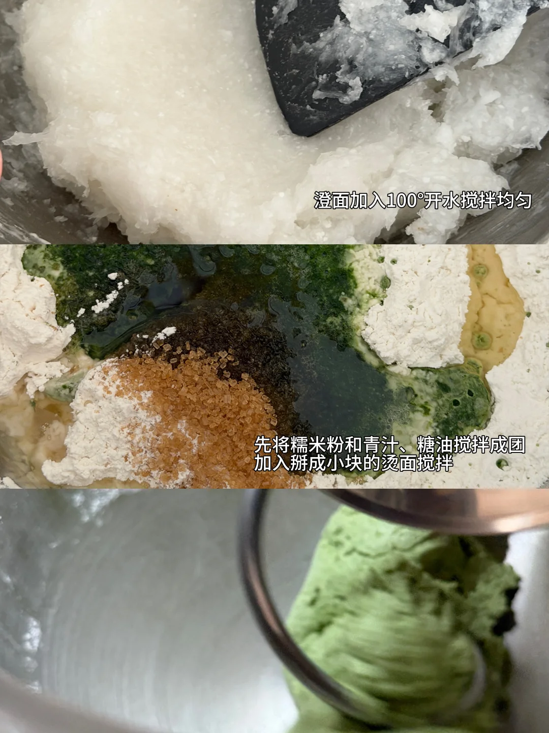 之前吃过一位姐姐包的纯手工的青团就再也吃不了工业青团了[捂脸R]然而那个姐姐今年要做的晚一点,馋的我自己买了艾草试着包 第一次包已经很满意了,就是咬起来馅料实在太多了,我喜欢皮厚一点的,下次不贪心了🤣 配方是8个的份量,整体份量➗8即可。配方来自青团皮 糯米粉250g 艾草汁240ml 糖15g 玉米油13ml 成团后加烫面: 澄面75g 开水125g 红薯泥蛋黄肉松馅: 红薯泥(20*4) 红薯60g蒸熟 炼乳15g 奶粉5g 蛋黄肉松(12*4) 肉松20g 蛋黄20g 沙拉酱8g 黑芝麻花生:(25*4) 黑芝麻粉55g 花生30g 白糖10g 香油5g-10g(根据干湿度调整,成团即可,不要太稀) 馅料团成团之后冻一会儿更好包 水开上锅蒸10分钟,焖10分钟再掀盖子