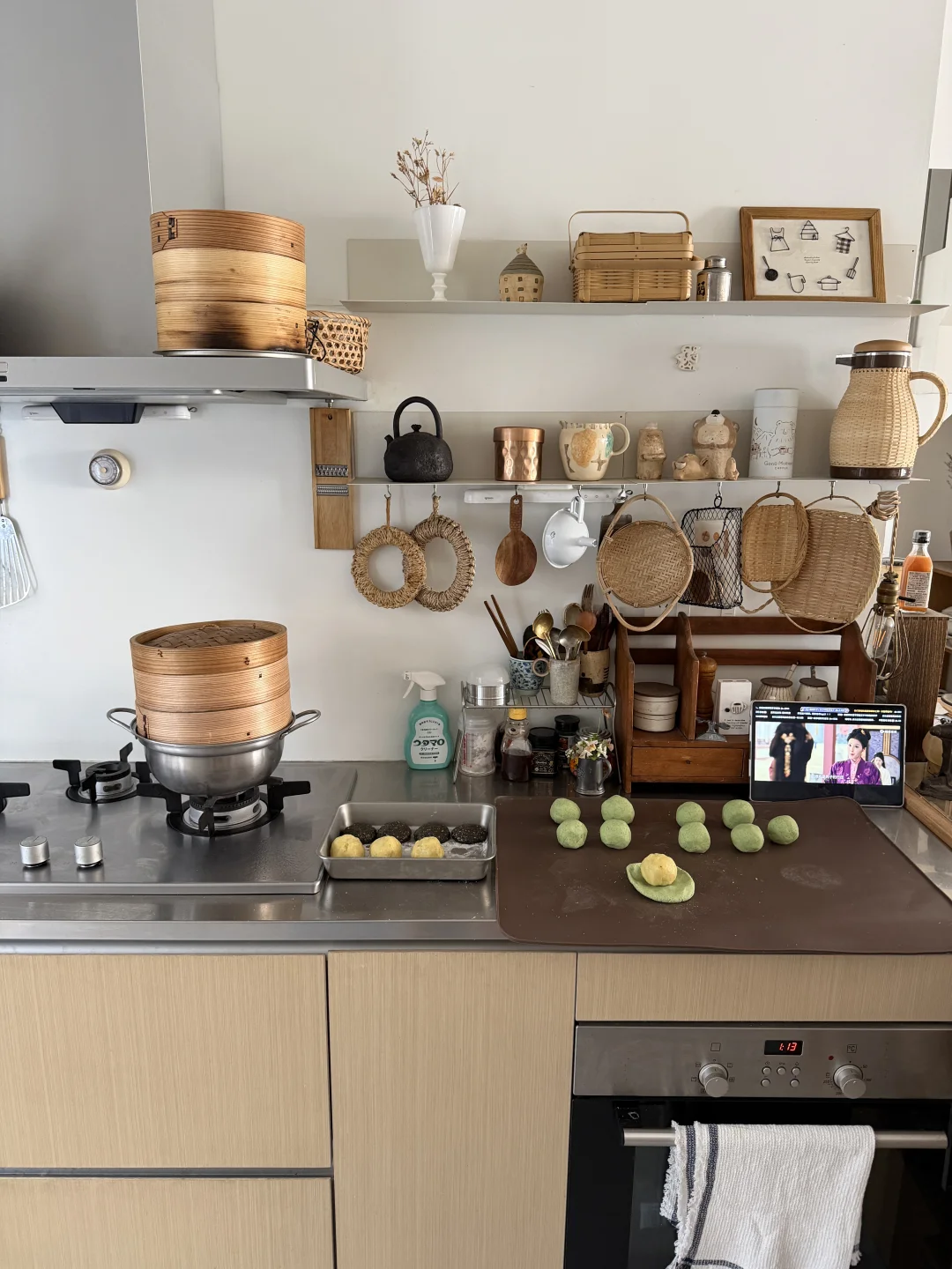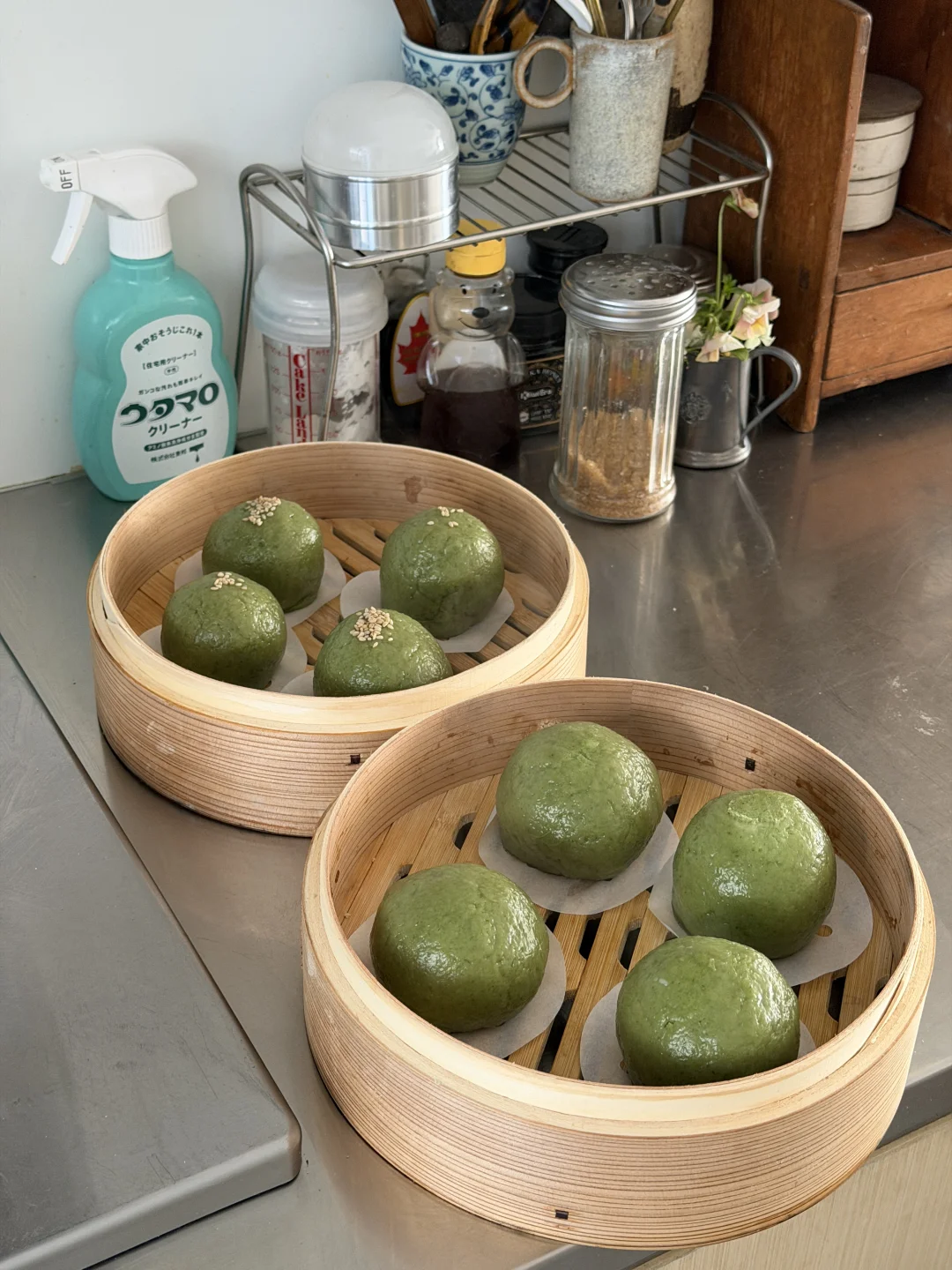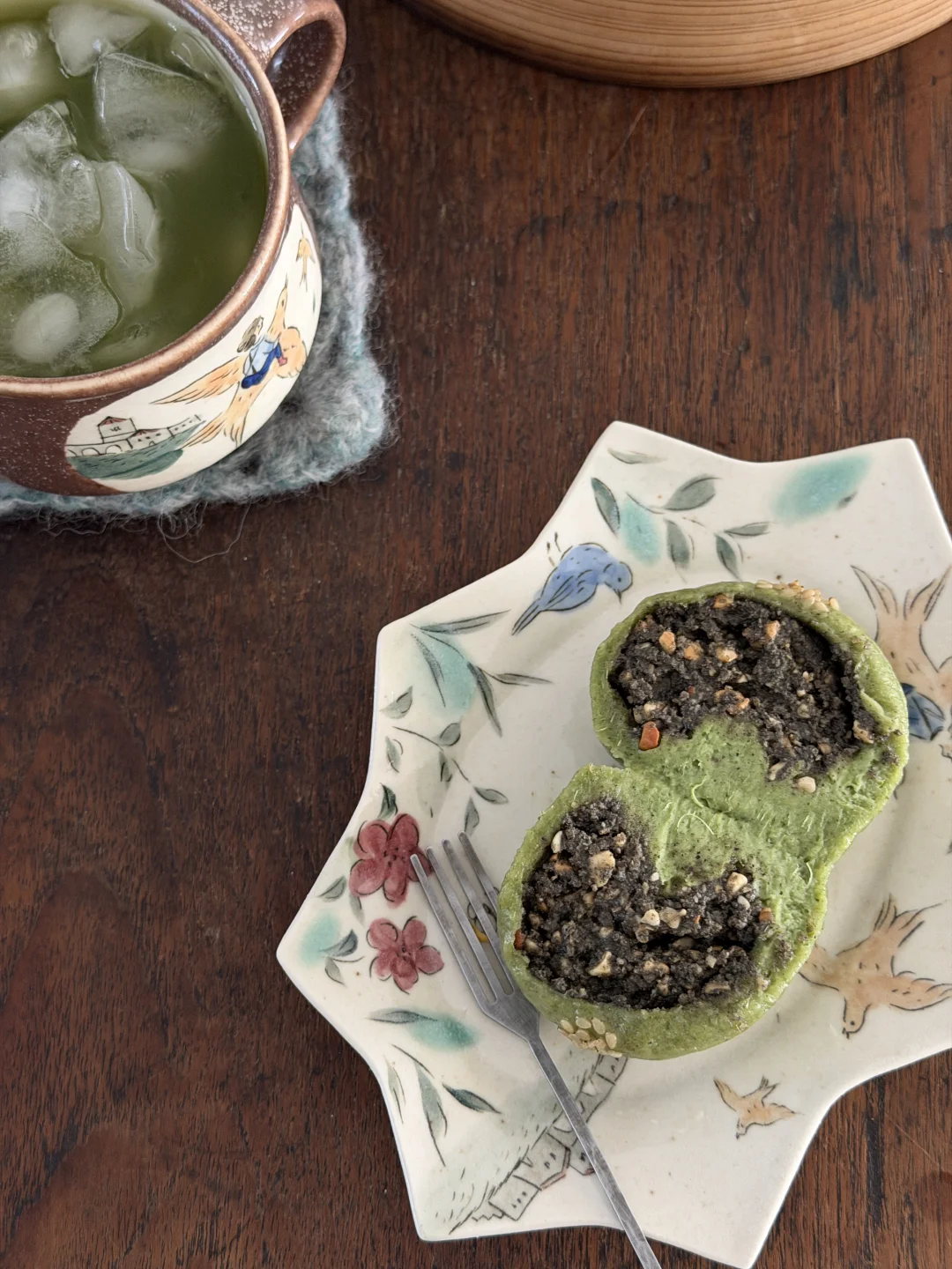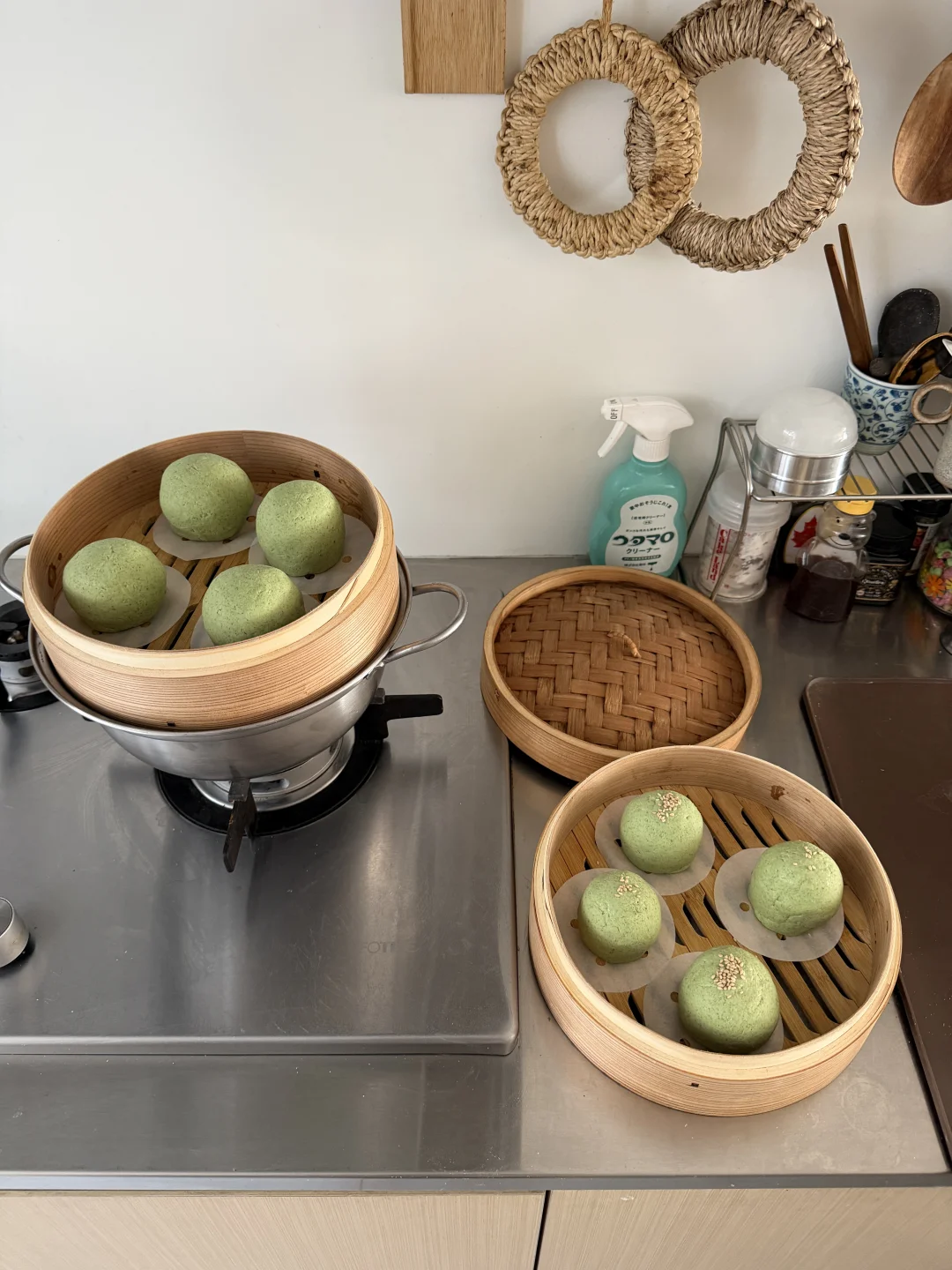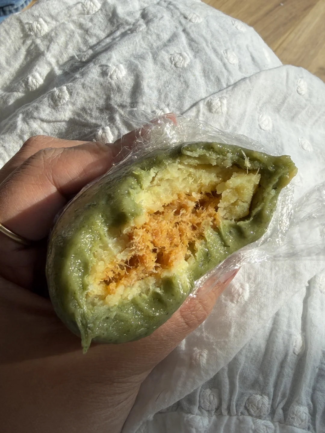 之前吃过一位姐姐包的纯手工的青团就再也吃不了工业青团了[捂脸R]然而那个姐姐今年要做的晚一点,馋的我自己买了艾草试着包 第一次包已经很满意了,就是咬起来馅料实在太多了,我喜欢皮厚一点的,下次不贪心了🤣 配方是8个的份量,整体份量➗8即可。配方来自青团皮 糯米粉250g 艾草汁240ml 糖15g 玉米油13ml 成团后加烫面: 澄面75g 开水125g 红薯泥蛋黄肉松馅: 红薯泥(20*4) 红薯60g蒸熟 炼乳15g 奶粉5g 蛋黄肉松(12*4) 肉松20g 蛋黄20g 沙拉酱8g 黑芝麻花生:(25*4) 黑芝麻粉55g 花生30g 白糖10g 香油5g-10g(根据干湿度调整,成团即可,不要太稀) 馅料团成团之后冻一会儿更好包 水开上锅蒸10分钟,焖10分钟再掀盖子