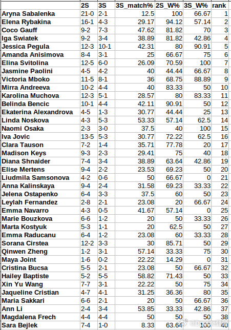 三盘女王!佩古拉本赛季42%的比赛都打满了三盘,决胜盘胜率高达91%。而萨姆索诺