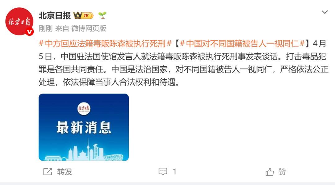 法国与其指责中国,不如提醒本国公民遵守中国法律! 法国籍毒贩陈森4月4日在中国被执行死刑,他总计贩毒高达4吨,按中国法律,他可以被判处上千次死刑都不止! 但是,法国政府居然出面为他鸣冤叫屈,理由是法国早就废除了死刑,反对任何国家实施死刑。 各国法律确实有不同,但到一个国家就要遵守这个国家的法律。 在中国,任何人,不管是中国人,还是任何其他国家的人,只要在中国贩毒,只要达到法定的死刑标准,都会同样被判处死刑。法国人也不能例外! 法国政府与其指责中国,不如提醒法国公民到任何国家都要遵守该国法律,要特别提醒在中国贩毒可能面临死刑。