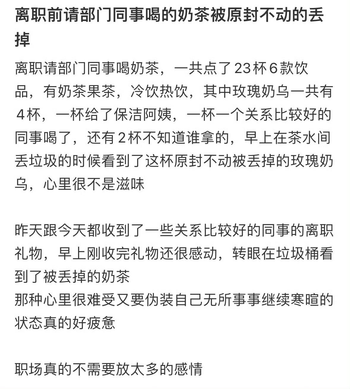 离职前请部门同事喝的奶茶被原封不动的丢掉