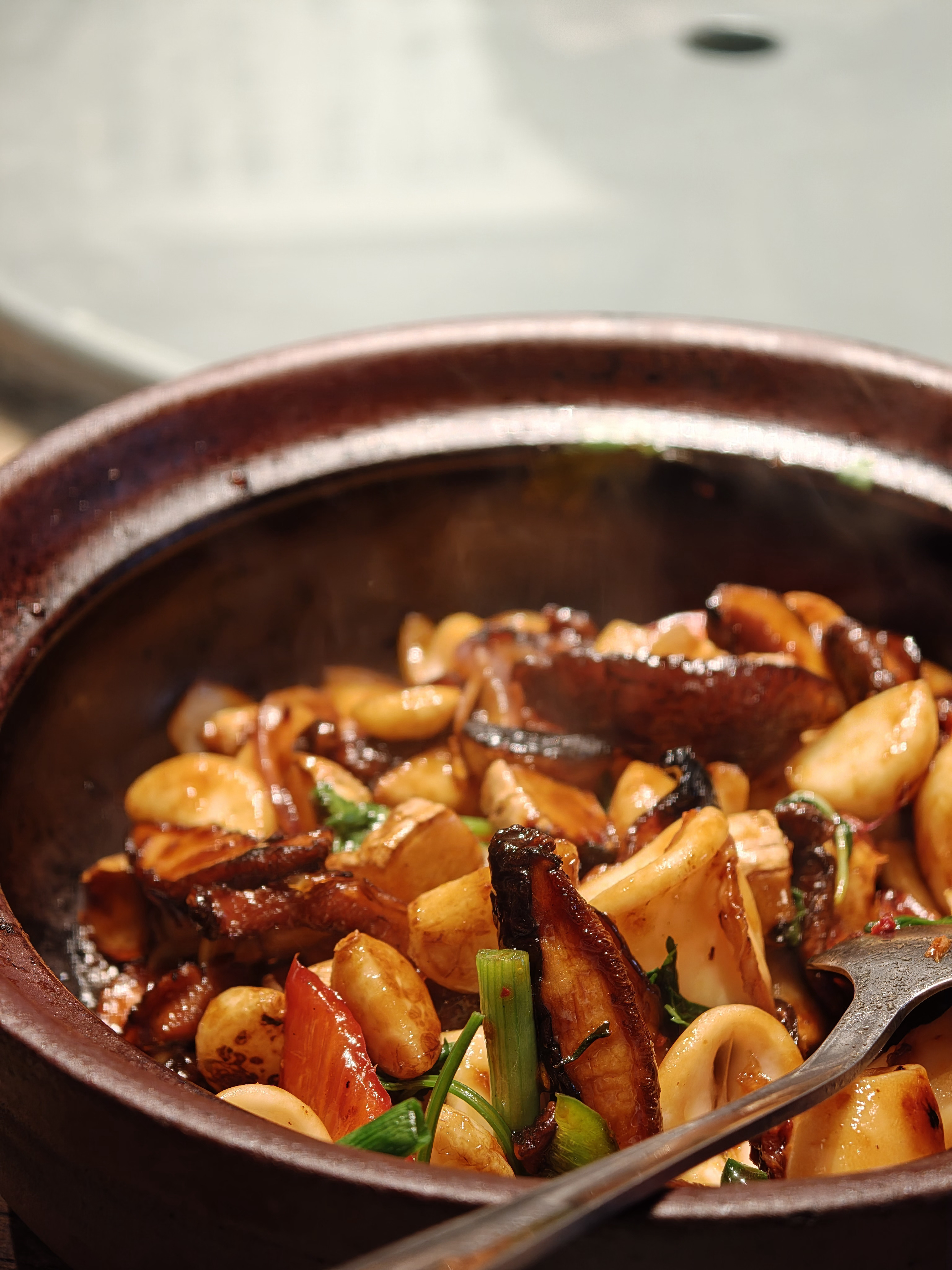 这家店环境很不错,室外云雾缭绕,还养了小鸭、松鼠和孔雀等小动物。包厢设计也比较讲究,外墙的砖瓦有点陈家祠的感觉。