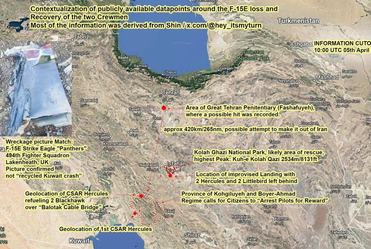 现在外界普遍怀疑美方对外公布的搜救F-15E战斗机两名飞行员的叙事有很大一部分是假的。 按照美方的叙事,美军在科吉卢耶-博耶艾哈迈德省救走了第一名飞行员,然后又在一天时间后从相距第一名飞行员110 英里(177公里)处的伊斯法罕郊区救走第二名飞行员。 如果这样的话,那就表明第二名飞行员(F-15E后座的武器控制员)需要在一天内移动了 110 英里(177公里),这还不包括因洞穴和山脉而增加的里程。同样根据美方的说法,第二名飞行员落地之后受了伤。那么,他怎么可能在有伤的情况下,一边躲着伊朗人的搜捕,一边还能健步如飞,于一天时间内在复杂的山地地形上移动110英里。 F-15E战斗机的弹射程序是后座先弹射,不到一秒的间隔前座再弹射。假设弹射高度为20000英尺(6096米),两名机组乘员弹射后落地的最大距离无论如何也不可能达到110英里。