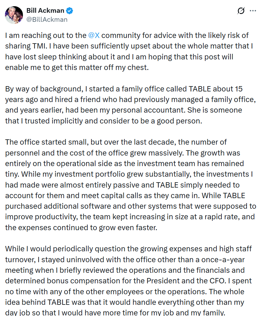 亿万富翁 + 知名对冲基金经理 Bill Ackman,在 X 上发长文控诉,她