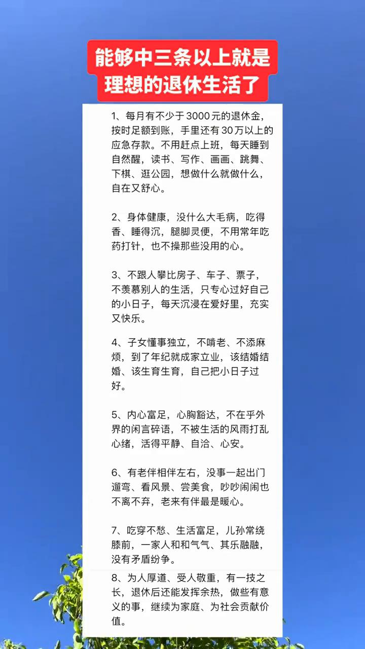 能够中三条以上就是理想的退休生活了。 ·1、每月有不少于3000元的退休金。按时足额到账,手里还有30万以上的应急存款。不用赶点上班,每天睡到自然醒,读书、写作、画画、跳舞、下棋、逛公园,想做什么就做什么,自在又舒心。 ·2、身体健康,没什么大毛病,吃得香、睡得沉,腿脚灵便,不用常年吃药打针,也不操那些没用的心。 ·3、不跟人攀比房子、车子、票子,不羡慕别人的生活,只专心过好自己的小日子,每天沉浸在爱好里,充实又快乐。 ·4、子女懂事独立,不啃老、不添麻烦,到了年纪就成家立业,该结婚结婚、该生育生育,自己把小日子过好。 ·5、内心富足,心胸豁达,不在乎外界的闲言碎语,不被生活的风雨打乱心绪,活得平静、自治、心安。 ·6、有老伴相伴左右,没事一起出门遛弯、看风景、尝美食,吵吵闹闹也不离不弃,老来有伴最是暖心。 ·7、吃穿不愁、生活富足,儿孙常绕膝前,一家人和和气气、其乐融融,没有矛盾纷争。 ·8、为人厚道、受人敬重,有一技之长,退休后还能发挥余热,做些有意义的事,继续为家庭、为社会贡献价值。