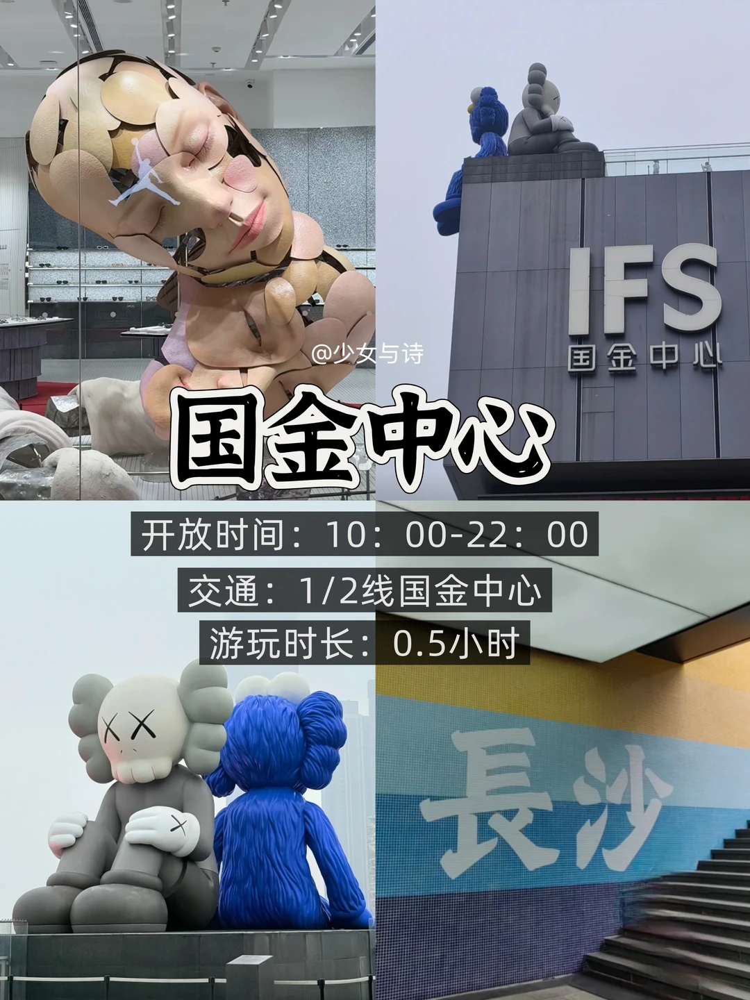 4️⃣五一广场、IFS国金中心、黄兴路步行街:长沙核心商圈,免费畅玩。国金中心7楼KAWS雕塑是打卡热点,步行街美食云集,黑色经典臭豆腐、茶颜悦色不容错过。