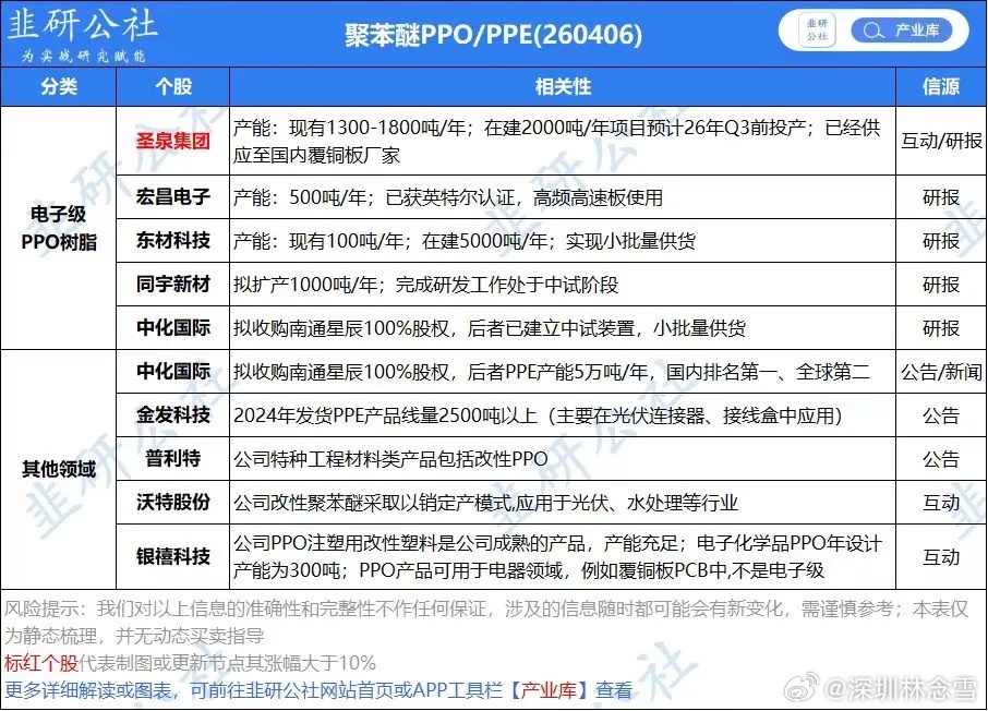 圣泉集团:1300吨/年电子级PPO,稳定供货