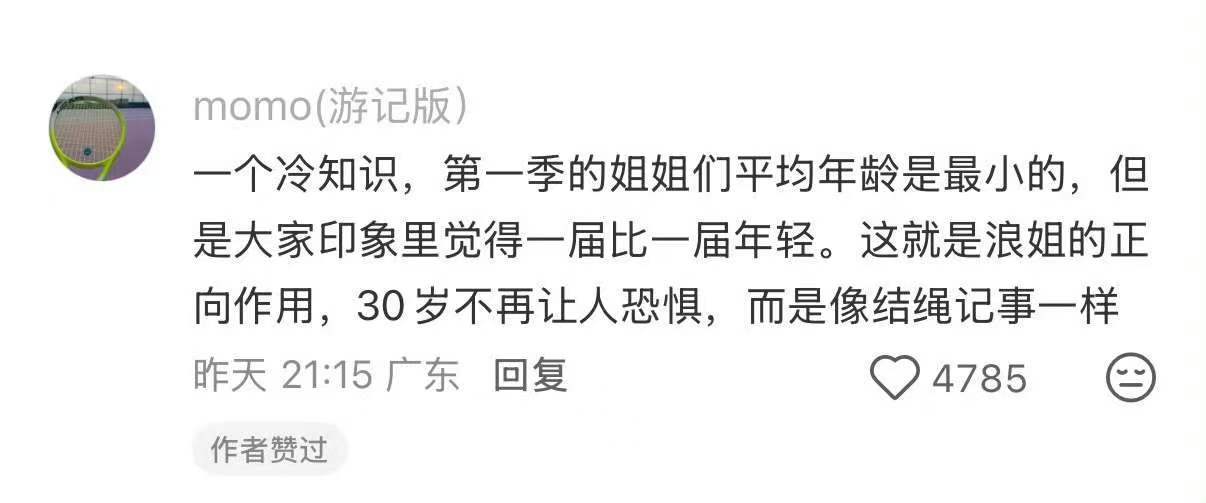浪姐的意义浪姐一直办下去的意义浪姐一直办下去的意义,一个冷知识,第一季的姐姐们平均年龄是最小的,但是大家印象里觉得一届比一届年轻。这就是浪姐的正向作用,30岁不再让人恐惧,而是像结绳记事一样