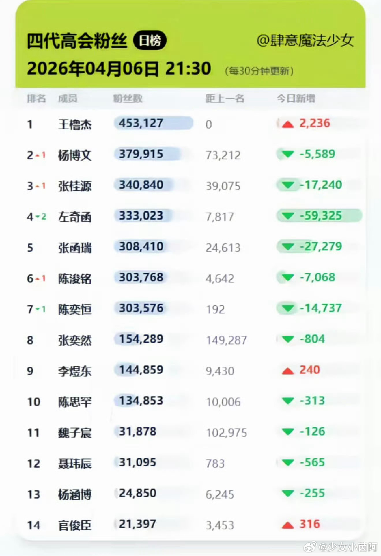 七番凌晨两点半的时候陈奕恒还是四番,不到一天的时间掉到了七番。