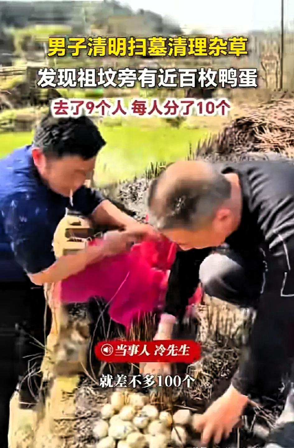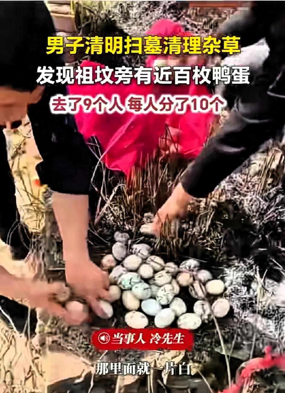 太惊喜了!江西九江一家9口清明扫墓,本来只是安安静静尽份孝心,谁能想到,却意外收获了一份平淡又暖心的小惊喜。 一家人按照习俗来到祖坟前,专心清理周边的杂草和杂物,全程态度庄重,只想尽到后辈的孝心,寄托对先人的思念。原本一切都很平常,就在大家扒开祖坟旁边的野草时,无意间发现草丛里藏着一个鸭窝,里面堆满了白白胖胖的鸭蛋,密密麻麻摆在一起,看着十分规整。 众人没有过分惊讶,只是觉得意外又欣喜,仔细数了数,鸭蛋数量快有一百个。原本肃穆的祭祖氛围,因为这份意外的小发现,多了几分温和的暖意,一家人也都觉得这份偶遇很是难得。 大家笑着说起,这窝鸭蛋刚好可以九个人平分,一人十个,分配得十分均匀,没有偏颇,也算是一份很凑巧的小福气。事后细想,这其实是很平常的自然现象,应该是附近农户散养的鸭子,觉得这片地方安静少人打扰,安全性高,便选择在这里筑巢下蛋,才形成了这样的场景。 没有所谓的特殊寓意,也没有夸张的幸运说辞,只是生活里一场普普通通的巧合,却让原本严肃的祭祖时刻,多了一丝温情与暖意。比起那些扫墓时遇到的小烦恼,这家人的际遇,不过是平凡生活里的一点小确幸。 其实生活本就是由这些平淡的小瞬间组成,简单的巧合、不经意的小美好,就足以让人心情愉悦。我们祭祖是为了感念先人,而这样的小偶遇,也只是生活赠予的一份小美好。