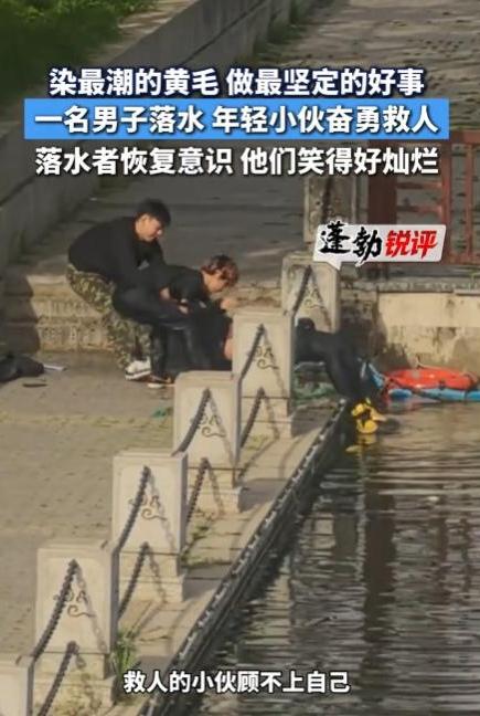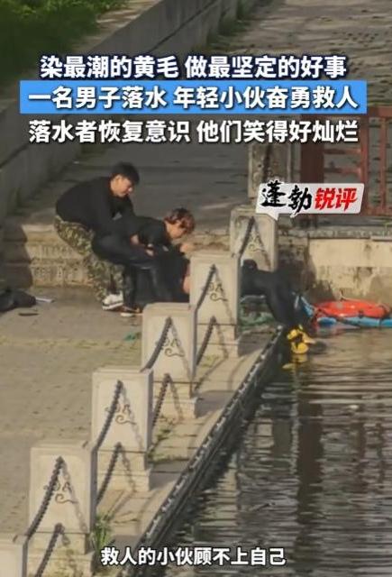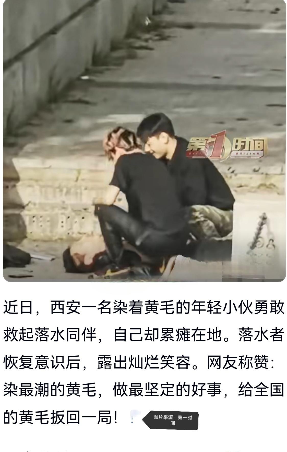 染最潮的黄毛,做最暖的好事小伙救人事迹 西安救人小伙 近日西安环城公园,一名男子不慎落水,染黄毛的年轻小伙毫不犹豫纵身跳河,拼尽全力将人救回岸边,自己累瘫在地。落水者恢复意识后露出灿烂笑容,网友刷屏点赞:染最潮的黄毛,做最坚定的好事! 善良从来没有固定模样,发色不定义人品,穿搭不代表善恶。为这位勇敢的少年点赞,为这份不带滤镜的善意点赞! 西安黄毛救人 正能量 少年担当 暖心瞬间 以貌取人要不得 图片来源:网络公开视频截图,仅用于传播正能量