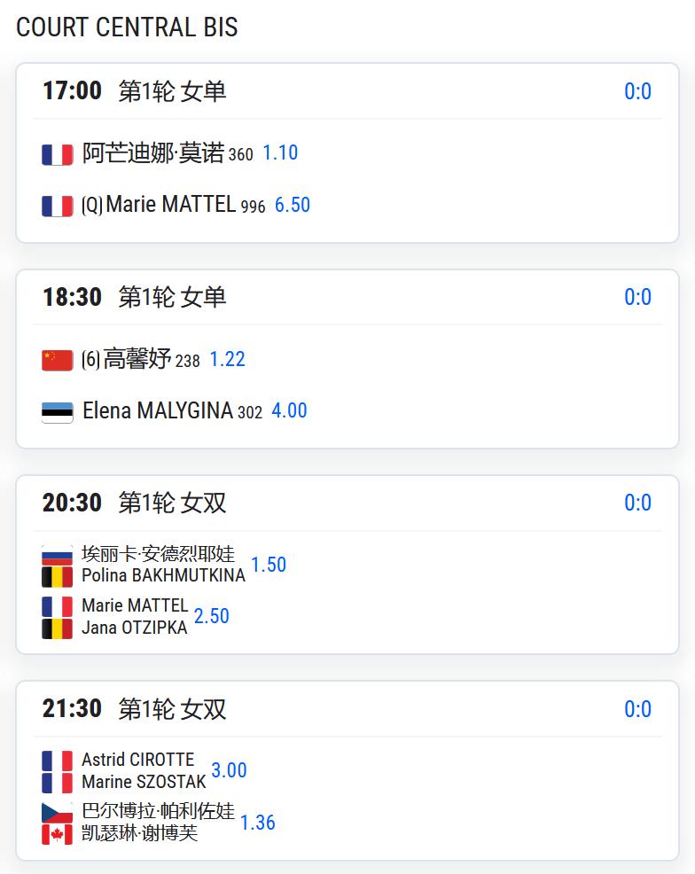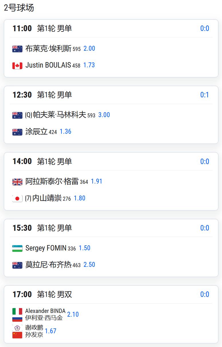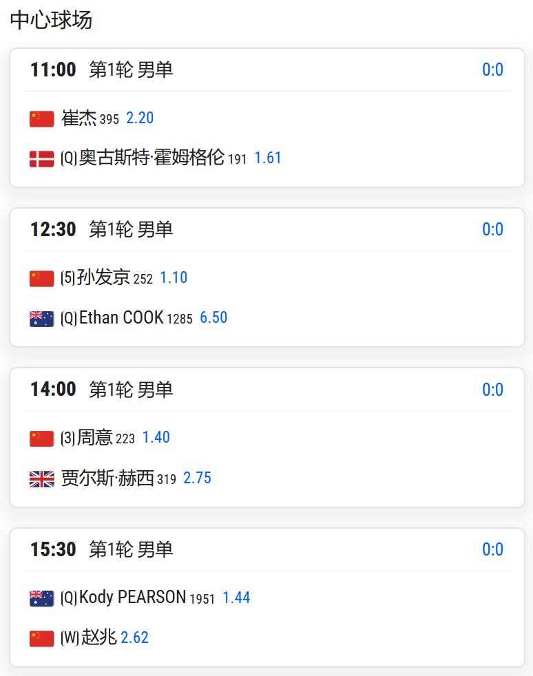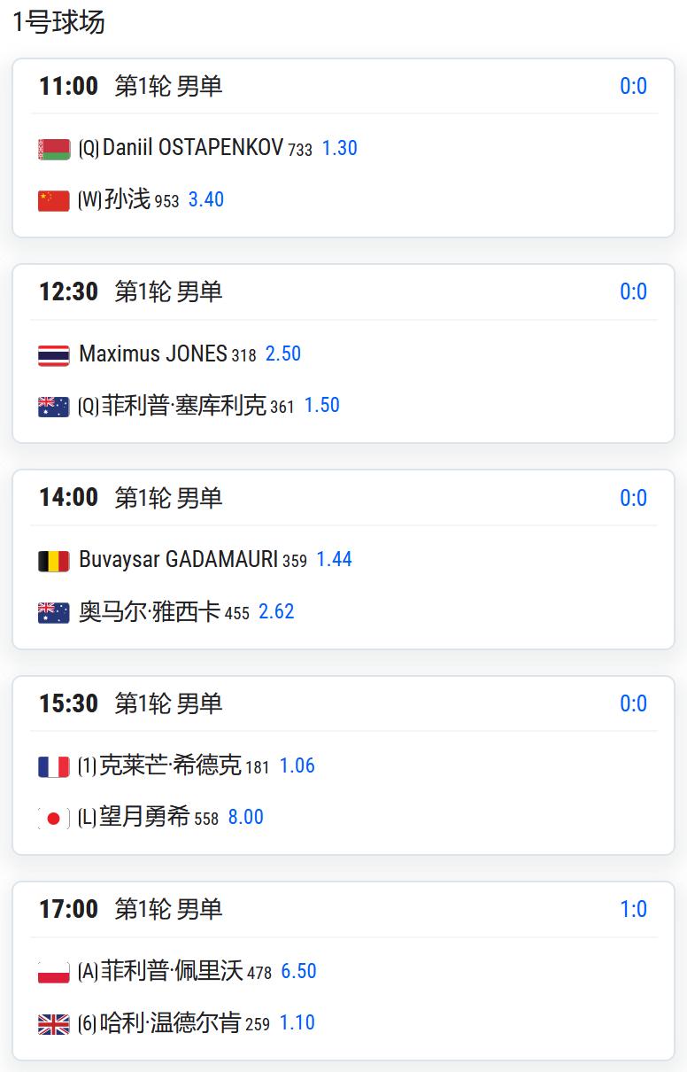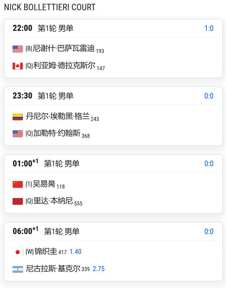 赛程: WTA500赛林茨站,女双第一轮,汤千慧搭档波兰的皮特尔将对阵二宫真琴/拉姆斯登; 张帅搭档科斯蒂亚出战,将对阵斯蒂芬斯/沃雷涅茨。 CH75萨拉索塔,男单第一轮,吴易昺以头号种子出战,将对阵资格赛球员本纳尼; W75卡尔维,女单第一轮,高馨妤将对阵爱沙尼亚的马丽金纳; CH50武宁,男单第一轮,崔杰将对阵资格赛球员霍姆格伦; 孙发京将对阵资格赛球员库克; 周意对阵英国球员赫西; 持外卡出战的赵兆对阵资格赛球员皮尔森; 另一位外卡球员孙浅对阵资格赛球员奥斯塔彭科夫; 男双第一轮,孙发京搭档中国台湾的谢正鹏对阵宾达/西马金。