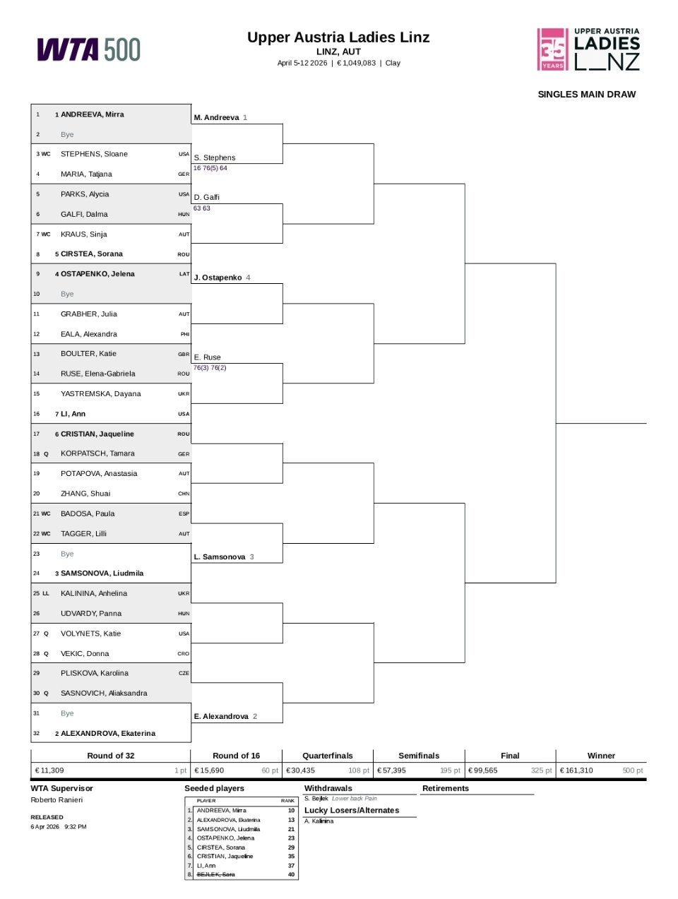 WTA500林茨站首日完整赛果🎾