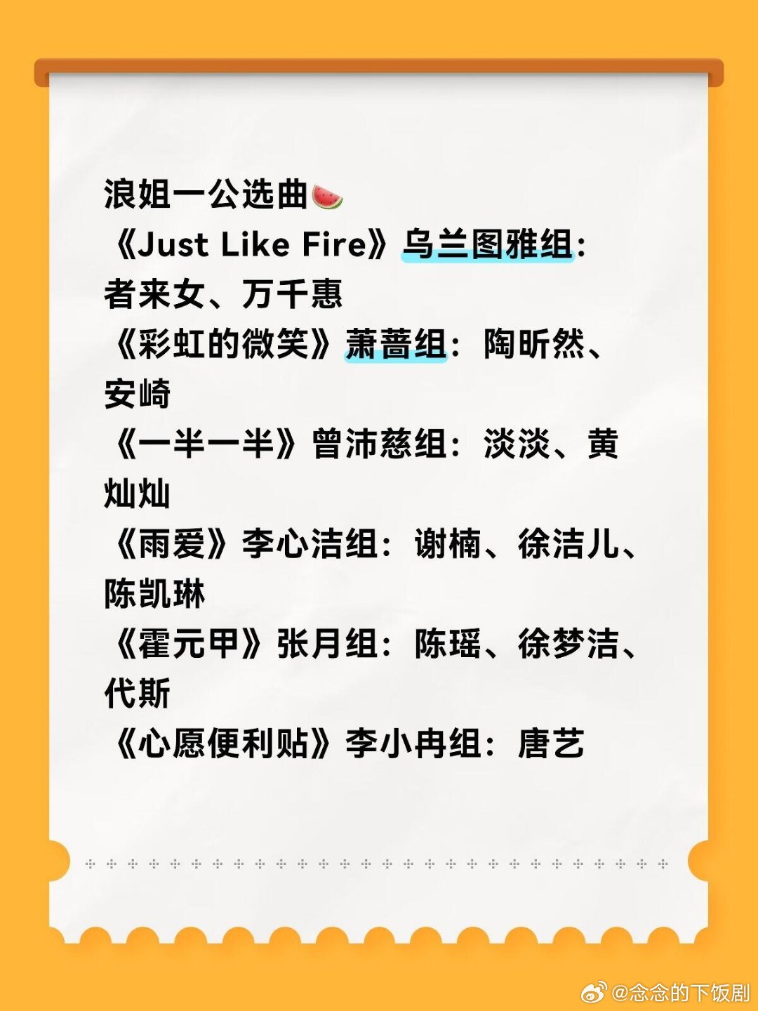 浪姐一公选曲🍉《Just Like Fire》乌兰图雅组:者来女、万千惠《彩虹的微笑》萧蔷组:陶昕然、安崎《一半一半》曾沛慈组:淡淡、黄灿灿《雨爱》李心洁组:谢楠、徐洁儿、陈凯琳《霍元甲》张月组:陈瑶、徐梦洁、代斯《心愿便利贴》李小冉组:唐艺昕、王濛《咏春》阚清子组:张艺上、温峥嵘《城北的花》叶一茜组:范玮琪、侯宇、何宣林《大艺术家》庄法组:江语晨、维妮娜《此刻最好的都在身边》孙怡组:张慧雯、赵子琪