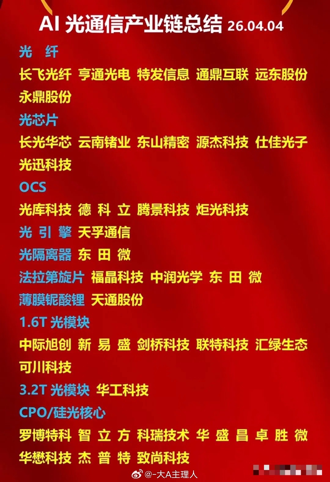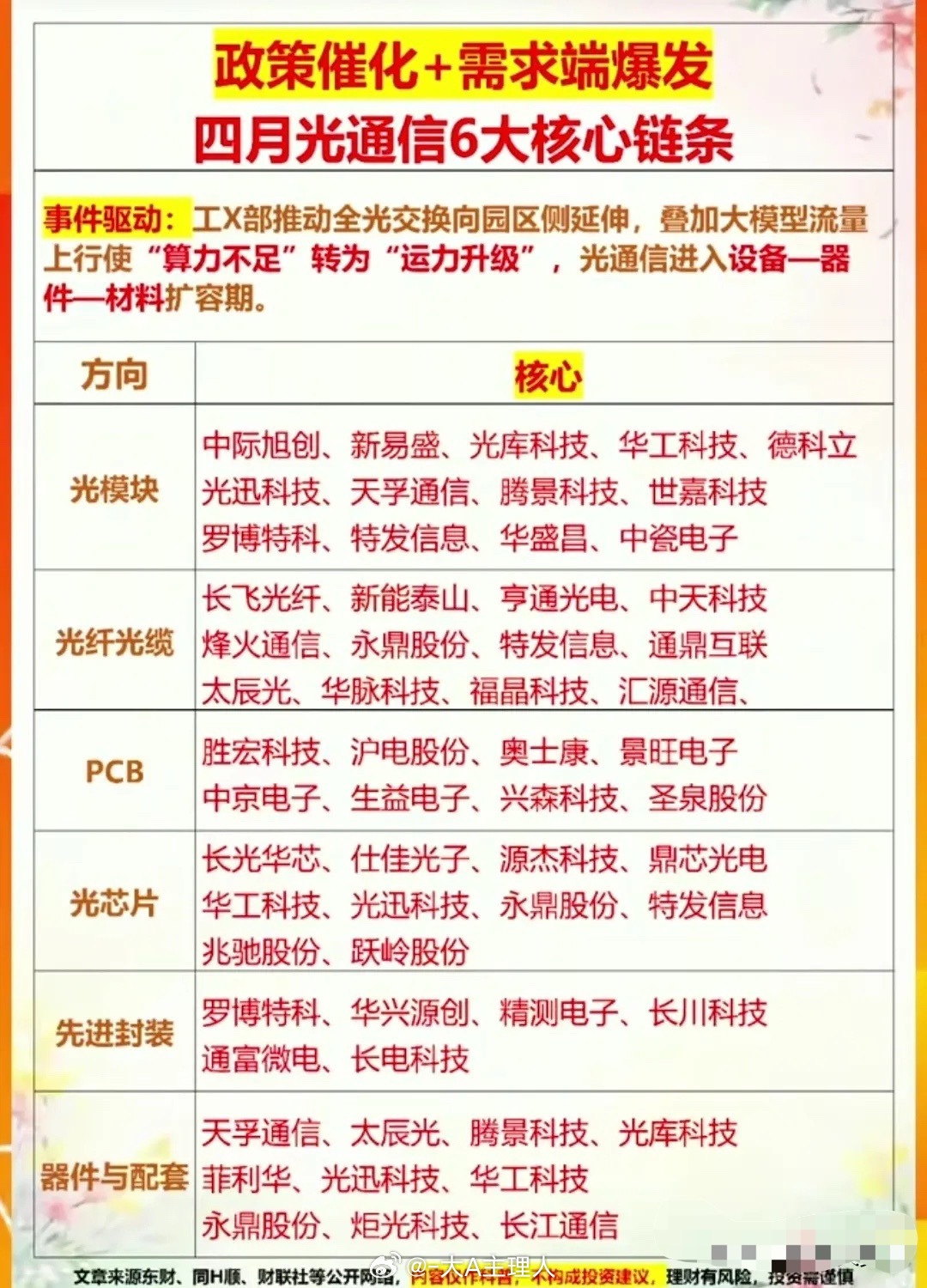 得光者得天下!AI算力时代,光通信全产业链爆发在即,十大行业龙头订单排到2028年!光通信迎来黄金时代!AI大模型流量持续上行,算力缺口倒逼运力全面升级,光通信作为算力网络的“高速公路”,正迎来政策催化+需求爆发的黄金周期,全产业链进入设备、器件、材料的全面扩容期,真正印证了“得光者得天下”的行业逻辑!从核心订单来看,光通信龙头企业早已手握百亿级超级订单,排期最长已至2028年:中际旭创、新易盛超300亿订单锁定英伟达、微软等全球头部客户…长飞光纤、亨通光电、中天科技等光纤光缆龙头,AI高端光纤订单爆满全球光棒产能稳居第一梯队,全产业链景气度拉满。从细分赛道来看,光通信产业链多点开花:✅ 光模块:AI算力核心刚需(中际旭创、新易盛、华工科技)✅ 光纤光缆:算力网络基建核心(长飞光纤、亨通光电、中天科技)✅ CPO/硅光是下一代高速互联核心方案(华工科技、天孚通信、罗博特科)………算力狂飙,运力先行!在AI大模型持续迭代、算力需求指数级增长的背景下,光通信作为算力网络的“生命线”,正迎来历史性发展机遇,全产业链龙头企业将持续受益于行业高景气,真正把握“得光者得天下”的时代红利!⚠️ 风险提示:本文仅为行业科普梳理,不构成任何投资建议,股市有风险,投资需谨慎。