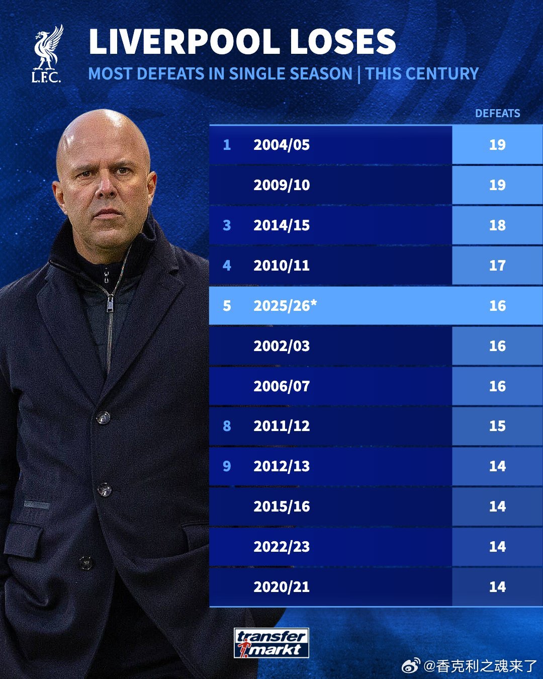 斯洛特的赛季16场失利,能排在第5,第一是19场,对的,你没看错,就是那个夺得欧