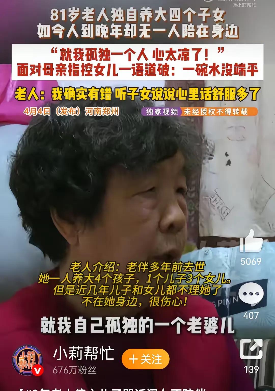 郑州小莉帮忙又出神人,八十岁老太把卖房钱都给了儿子,工作也给儿子安排好了,老了住闺女家,住两天就摔门走人,怪闺女不哄着她,居然还好意思上电视台找记者告状。 八十岁的老太,老伴走得早,当年一个女人拉扯四个孩子,一个儿子三个女儿,日子过得有多难可想而知。按说苦过来的,该心疼孩子,可她偏偏把所有的好都堆给了儿子。 家里卖房的钱,一分没剩全给了儿子;儿子找工作,也是她托关系跑断腿给安排得妥妥当当。三个女儿呢?从小看着弟弟吃香喝辣,自己穿补丁衣服,有好吃的先紧着弟弟,有活儿干先让女儿干,妥妥的“重男轻女”刻在骨子里。 女儿们长大成家,她没帮衬过多少,反而总念叨“儿子是根,得顾着儿子”。等老太年纪大了,走不动了,儿子那边却靠不住了——要么是被养得只会伸手,要么是有自己的小家顾不上,老太这才想起闺女的好。 她拎着包袱住到闺女家,本以为闺女会念着养育之恩好好伺候她。可她住了没两天,就开始挑三拣四:嫌闺女做的饭不合口,嫌闺女照顾得不够细致,稍不顺心就摔门走人,还逢人就说闺女不孝顺、不哄着她。 闺女心里委屈啊,这些年娘家的苦没处说,自己掏心掏肺照顾,换来的却是指责。老太见闺女不顺着自己,干脆找了电视台,想让记者帮着“评理”,哭着说自己孤苦伶仃,没人管她。 直到记者采访,女儿把真相摊开,大家才看清这局面的根源。老太把卖房钱、工作全给了儿子,把儿子宠成了“宝”,对三个闺女只有付出没有偏爱。如今儿子那边指望不上,才来黏闺女,还想让闺女无条件包容自己的坏脾气。 老太最后也承认自己当年偏心有错,可这话听着更像后知后觉的补救。年轻时偏心眼,把儿子养成了不懂感恩的样子,把闺女的心伤透了,老了才落得个儿子疏远、闺女心里有疙瘩的下场。 这事戳中了太多重男轻女家庭的痛点。父母偏心,看似偏爱了儿子,实则毁了亲子间的情分。被偏爱的有恃无恐,被亏待的寒心远离,最后养老的担子压在被亏待的孩子身上,还被指责不孝顺,说到底,都是偏心埋下的祸根。 各位读者你们怎么看?欢迎在评论区讨论。