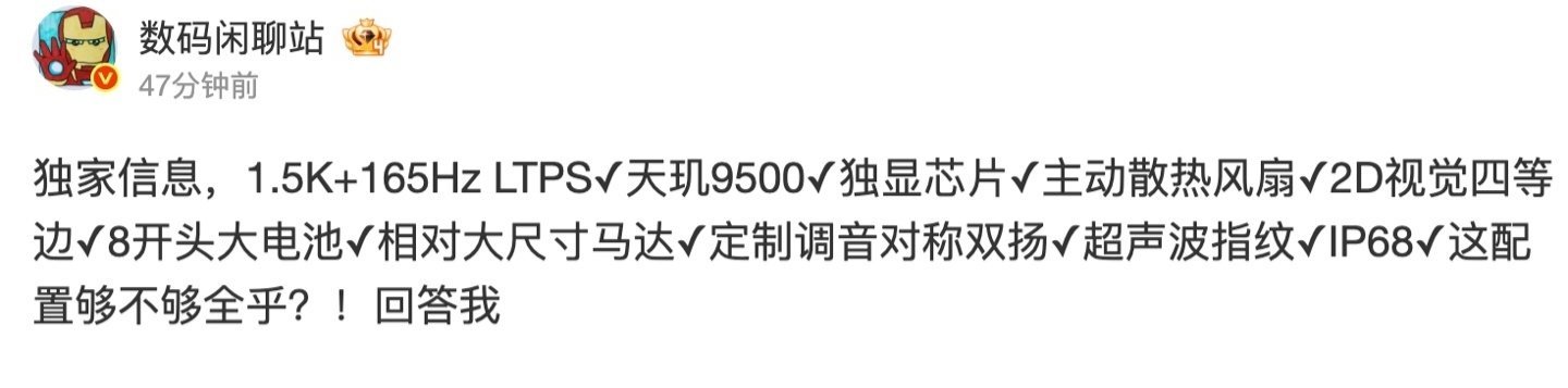 数码闲聊站 消息,某厂天玑 9500 新机将搭载 1.5K 165Hz LTPS 屏幕,具备独显芯片、主动散热风扇,屏幕采用 2D 视觉四等边设计,具备 8 开头大电池、相对大尺寸马达、定制调音对称双扬声器以及超声波指纹,还有 IP68 防尘防水。