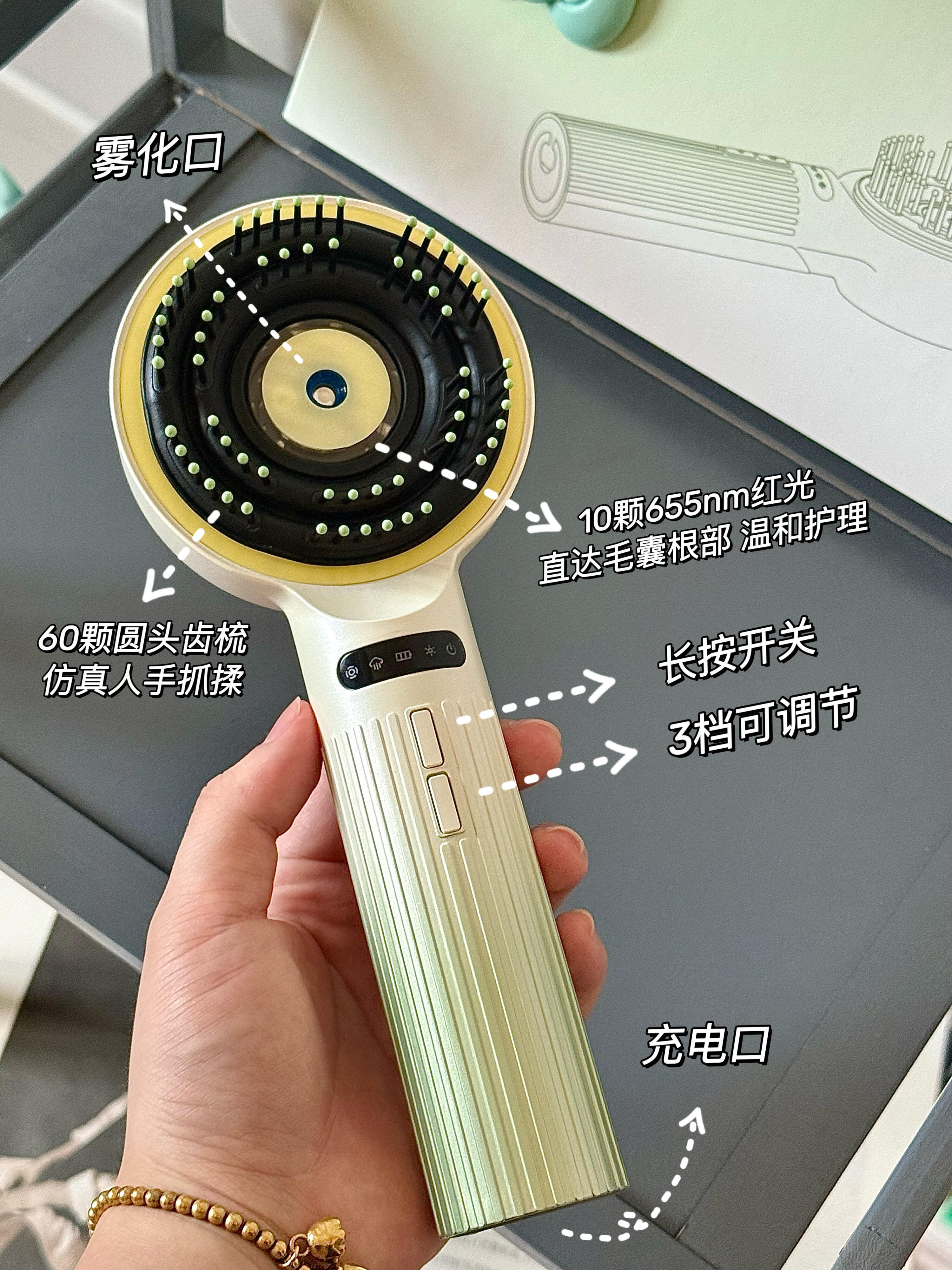 挖到宝!打开差点舍不得送人了……-毫不夸张!用过按摩梳的都说好🐮每天加班想策划想到头秃 头皮紧绷绷直到无意间用了介把按摩梳 简直颠覆认知!每次使用完都感觉头皮在大口大口地呼吸655nm红光在头皮表层一路渗透到毛囊根部三档雾化模式可以随意调节!倒上适合自己发质的精油精心呵护每一根发丝喷雾细腻 不仅可以滋养头皮还能促进毛囊生长梳完头发感觉又顺又亮!!谁敢说这是智商税整机可水洗 脏了水一冲就干净啦💦礼盒包装用来送礼尊嘟嘎嘎合适