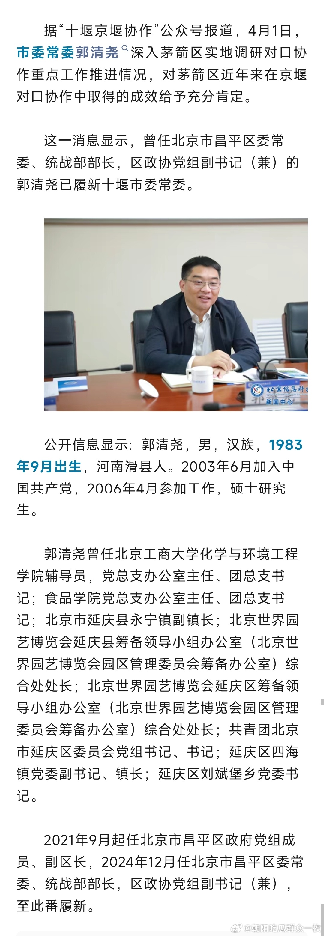 郭清尧履新湖北省十堰市委常委,他曾任北京市昌平区委常委、统战部部长,区政协党组副书记(兼)。