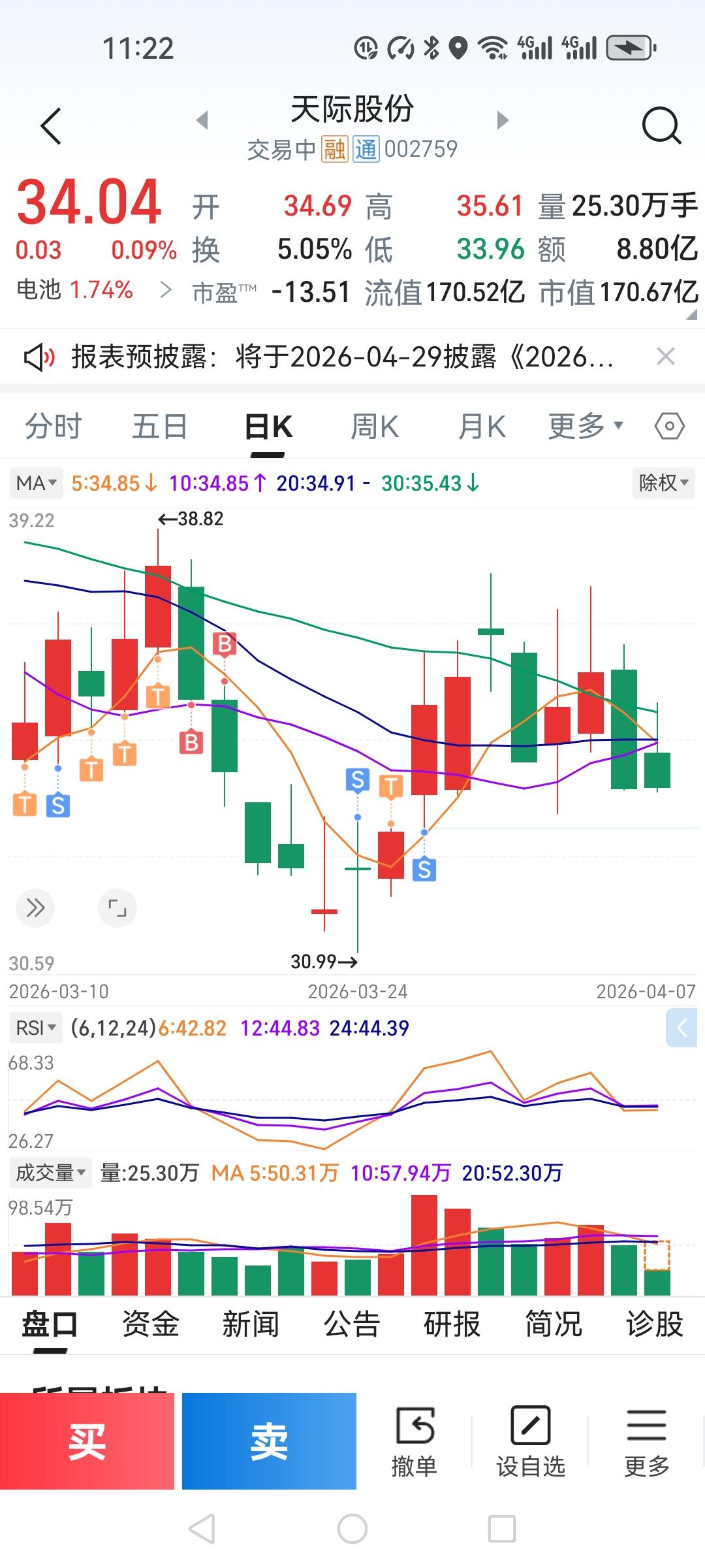 天际股份今天开盘34.69,最高冲到35.61,最低回踩33.96。本来计划很明确——开盘冲高就走,备忘录里写得清清楚楚。 结果呢?看着它蹭蹭往上拱,手就不听话了。“再等等”“还能更高”——三个念头一冒,卖单硬是没点下去。 现在掉到34了。全天利润从“落袋”变成“落空”,这滋味比亏钱还难受。亏钱能骂市场,这种只能骂自己。 说几条自己踩出来的坑: 第一,你改计划的那一秒,往往是情绪在替你拍板。开盘前脑子最清醒,那是你。盘中看着分时线心跳加速,那是另一个你。 第二,“再等等”三个字,是散户最大的亏损来源。等更高点、等翻红、等回本——等到最后,利润没了,本金也陷进去了。 第三,盘中临时改计划,十次里八次后悔。不是因为你判断错,是因为你改计划的理由不是分析,是眼红。 我现在就一招:开盘前定好三条线——止盈、止损、时间。到了就走,不看、不猜、不“再等等”。卖飞了认,卖早了也认,总比坐过山车强。 今天这课学费不算贵。但下次还犯,就真贵了。 你们有没有这种“想好了又变卦”的经历?评论区说说。