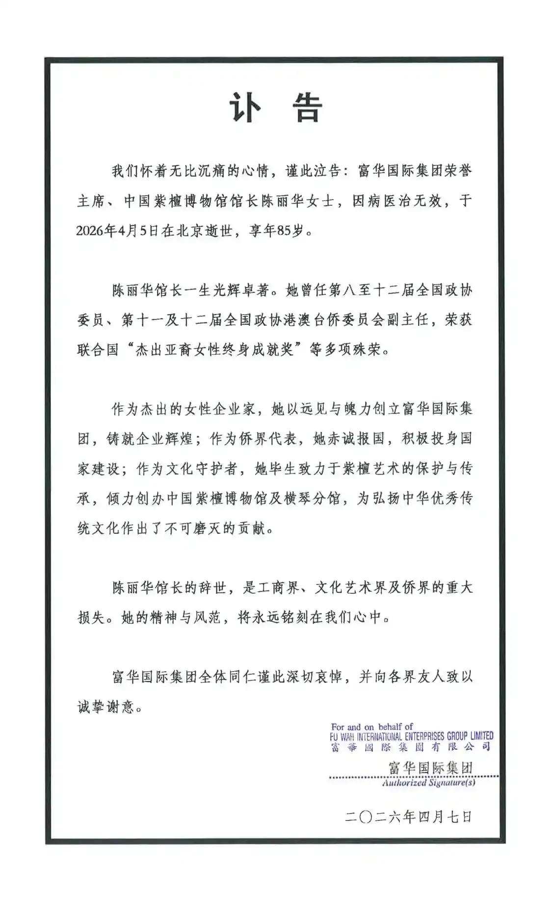一代传奇女企业家陈丽华,走了!官方讣告已发,字字沉重。2026年4月5日20