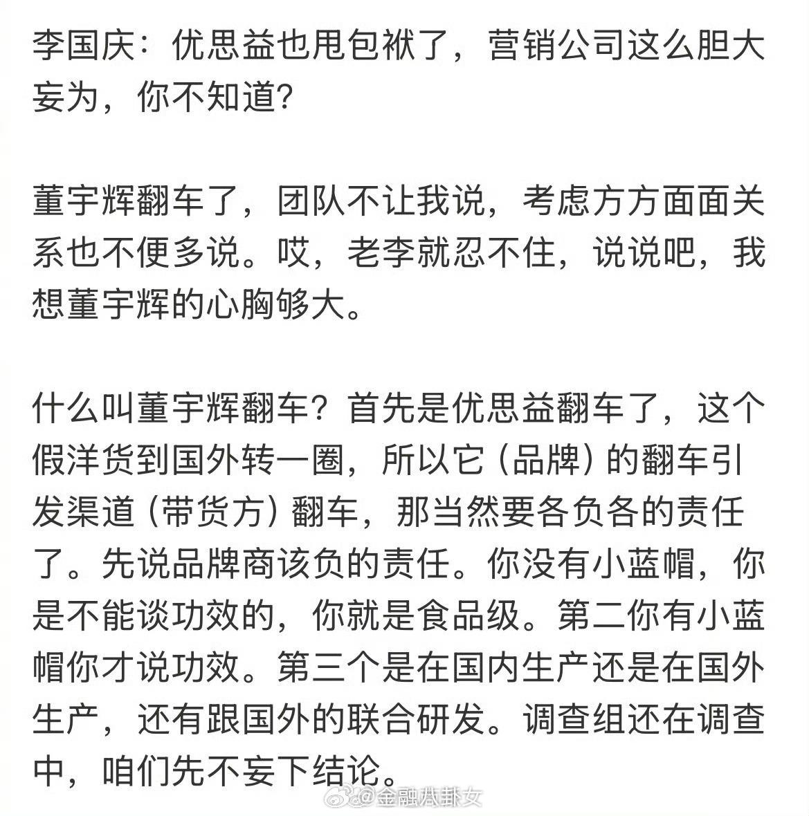 李国庆说优思益暴雷打醒董宇辉李国庆为董宇辉发声,相信与辉同行选品严格,但优思益翻