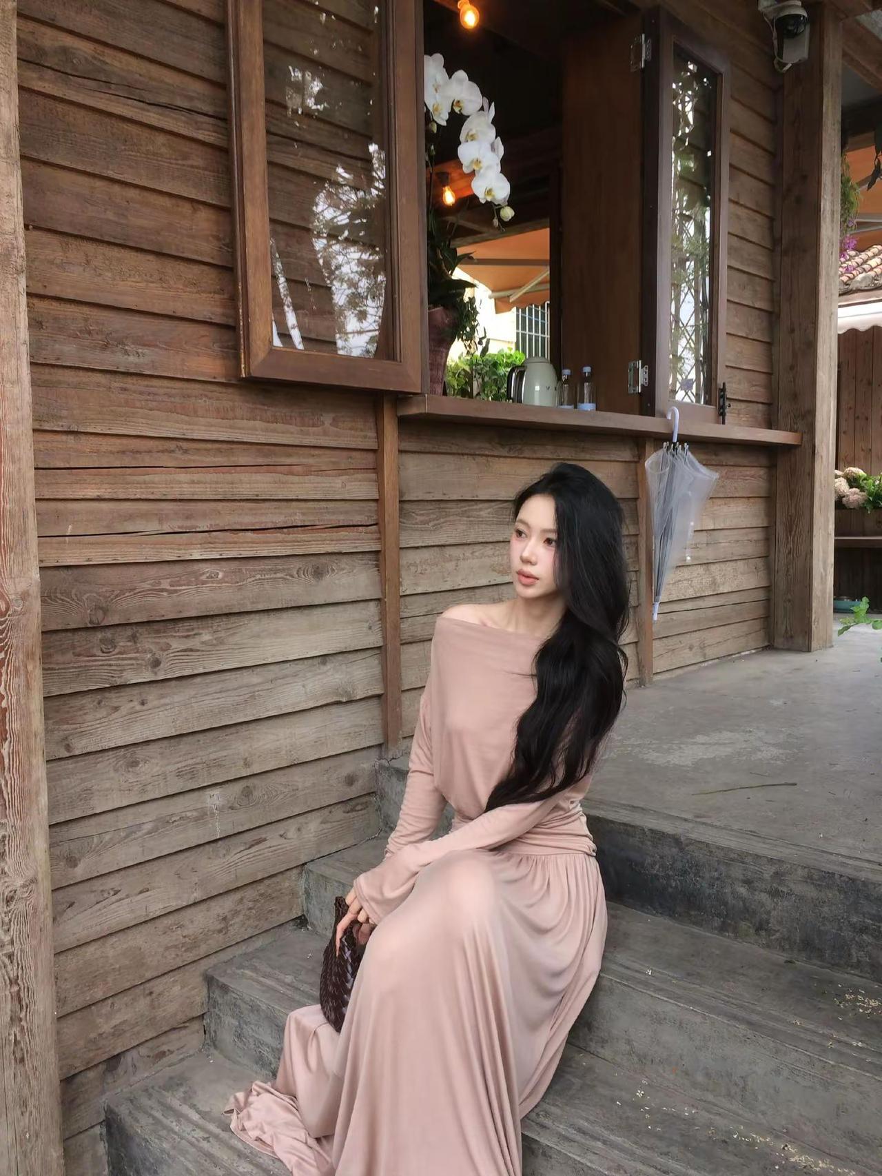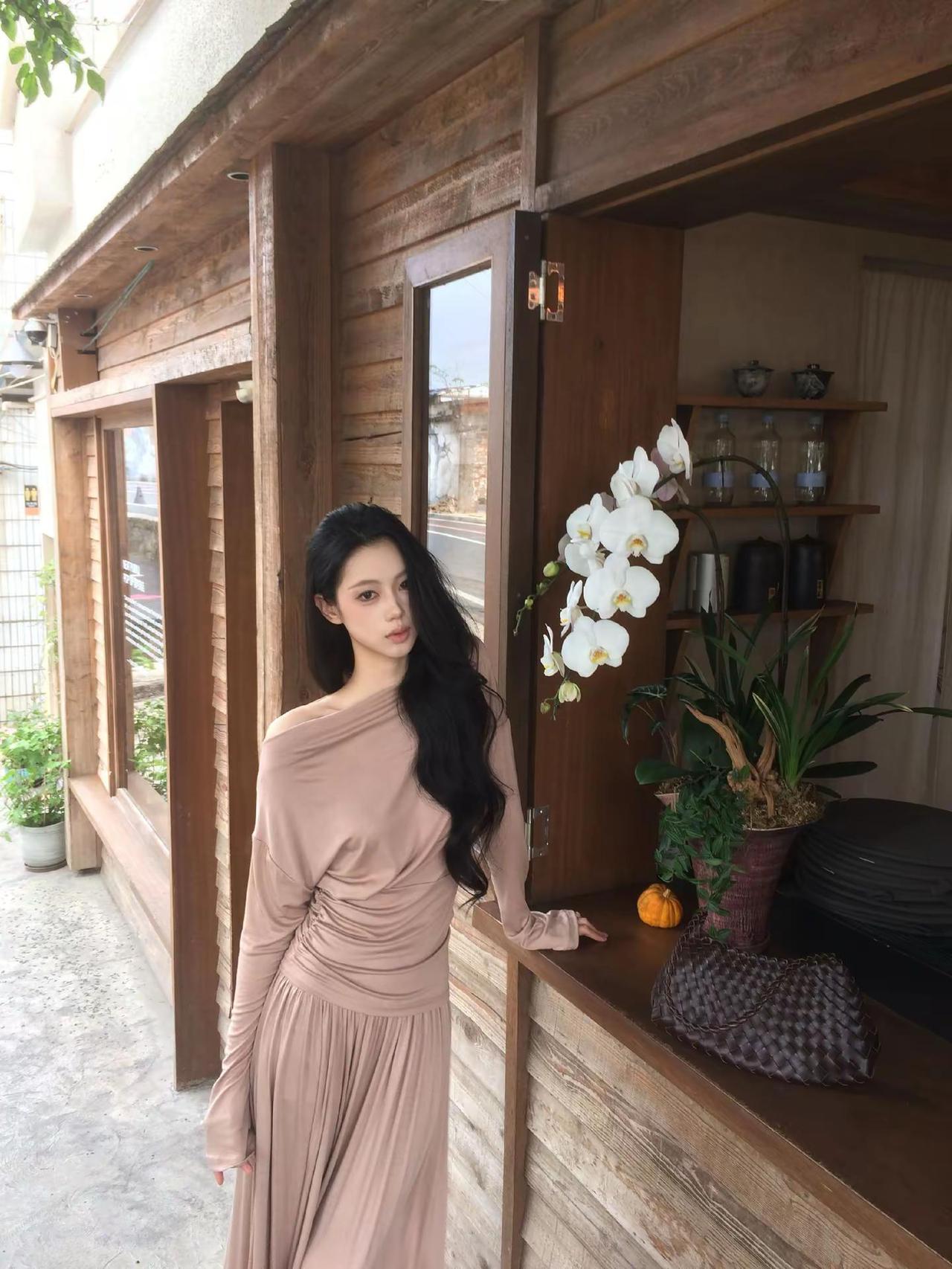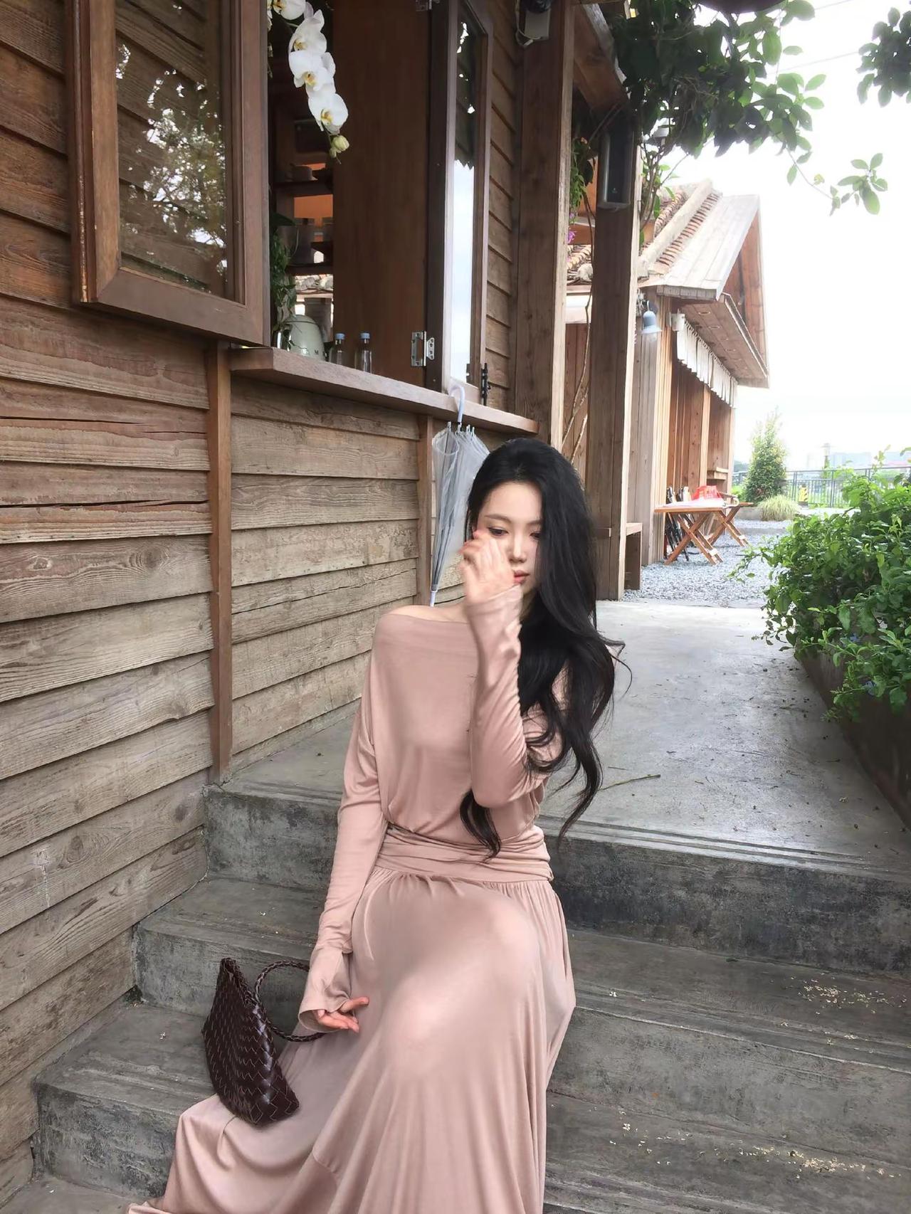 一袭长裙的御姐型美女,那气场简直绝了。就说穿搭,黑色丝绒包臀紧身长裙配黑色缎面吊