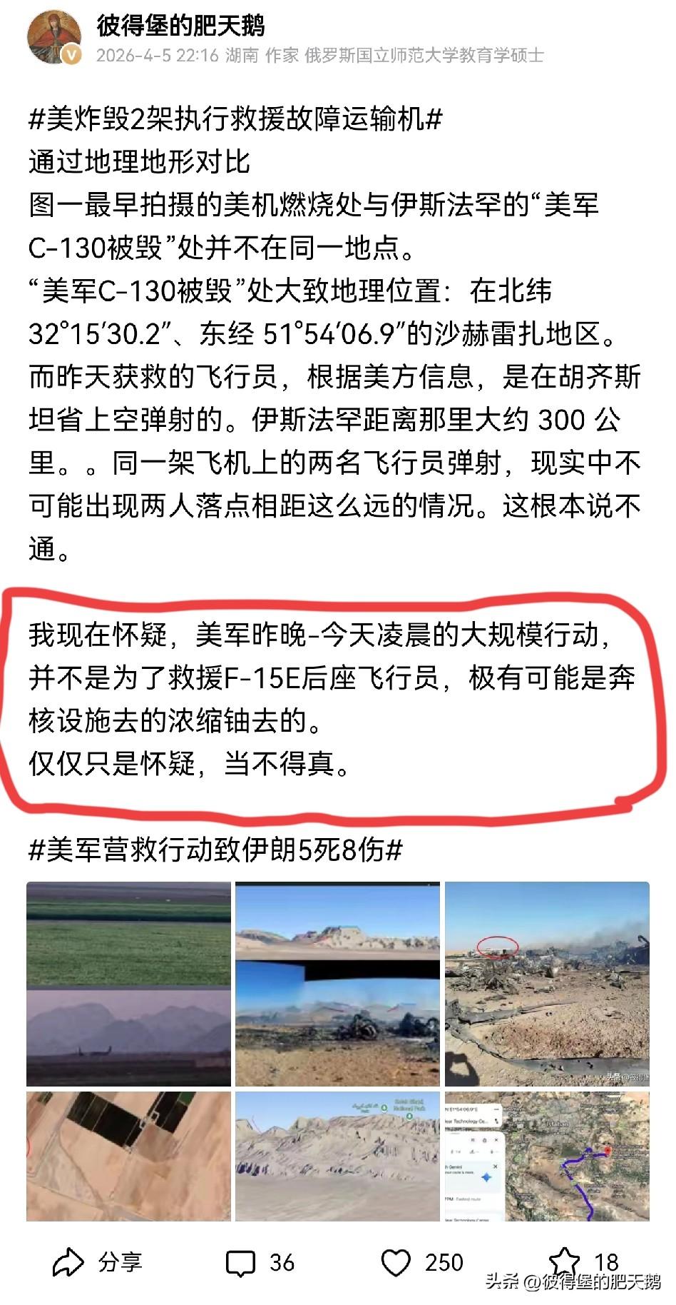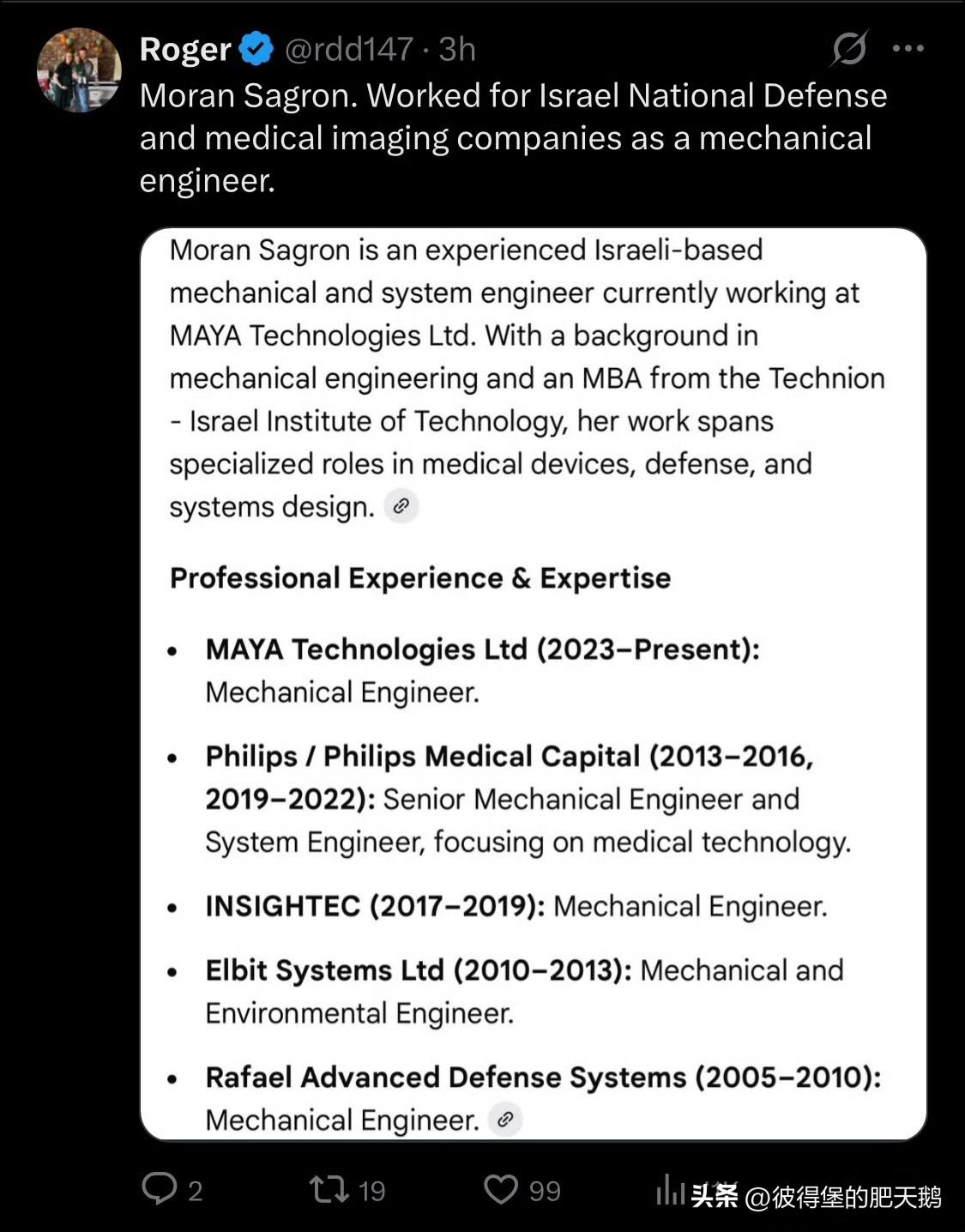 “我为祖国抢浓缩铀” 伊朗特种警察部队在美军毁机现场搜获的证件文件之一(见图1): 持证人:莫兰・萨格龙 国籍:以色列 出生日期:1981年3月4日 签证类型:美国 B1/B2 旅游商务签证 签发地:特拉维夫 有效期:2018年11月22日 - 2028 年11月22日 护照号:31930308。 国外网友扒出莫兰・萨格龙是一名核技术方向的机械工程师,她不是飞行员(见图2) 一名以色列的核技术人员为何会出现在此次美军高风险救援任务中呢? 为何这个所谓的救援前沿基地建立在距离伊斯法罕核设施不远的地区呢? 特朗普稍早前透露说,美军的“救援行动”动用的装备和兵力: 出动了155 架飞机 — 4 架轰炸机 — 64 架战斗机 — 48 架空中加油机 — 13 架 “救援” 飞机 — 及其他机型和数百名地面突击力量。 行动投入规模之大,远远超过了救援一名身处敌后的飞行员所需。 这些发现进一步推翻了美军及特朗普所称救援任务取得成功的说法,因为根本不存在所谓的救援行动,美军的这次行动目的大概率就是“我为祖国抢浓缩铀”。肥鹅前两天的猜测极有可能是真相。 事实上,“我为祖国抢浓缩铀”行动损失惨重,行动失败! 至于F-15E飞行员有没有被救,生死如何,谁在乎呢! #美军特种兵潜入伊朗救人场面失控# #特朗普回应伊朗10项要求# #美国营救行动损失惨重#