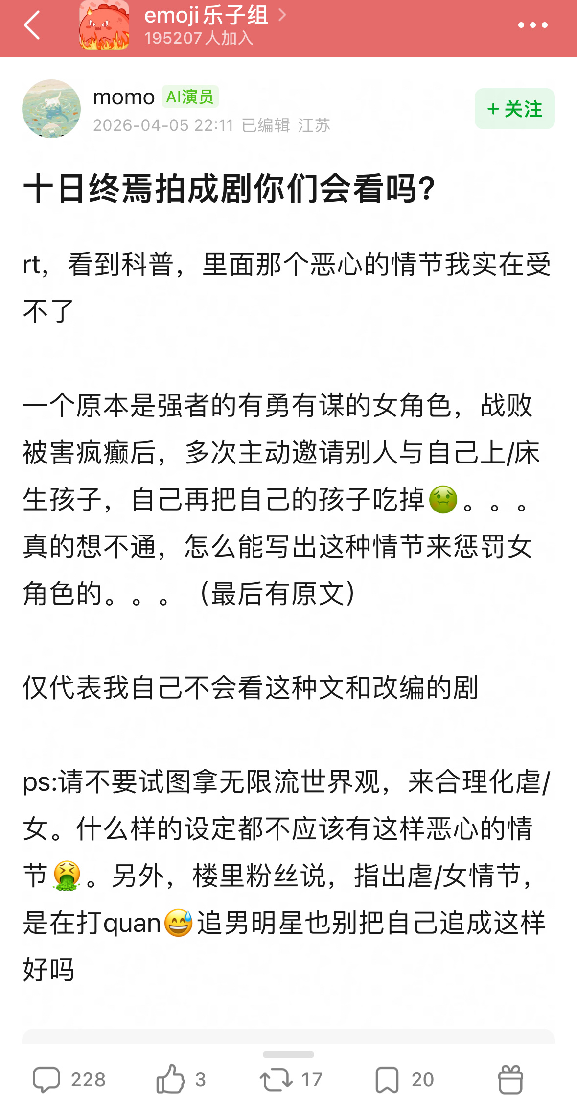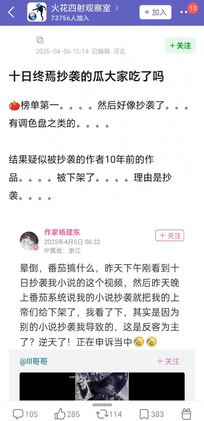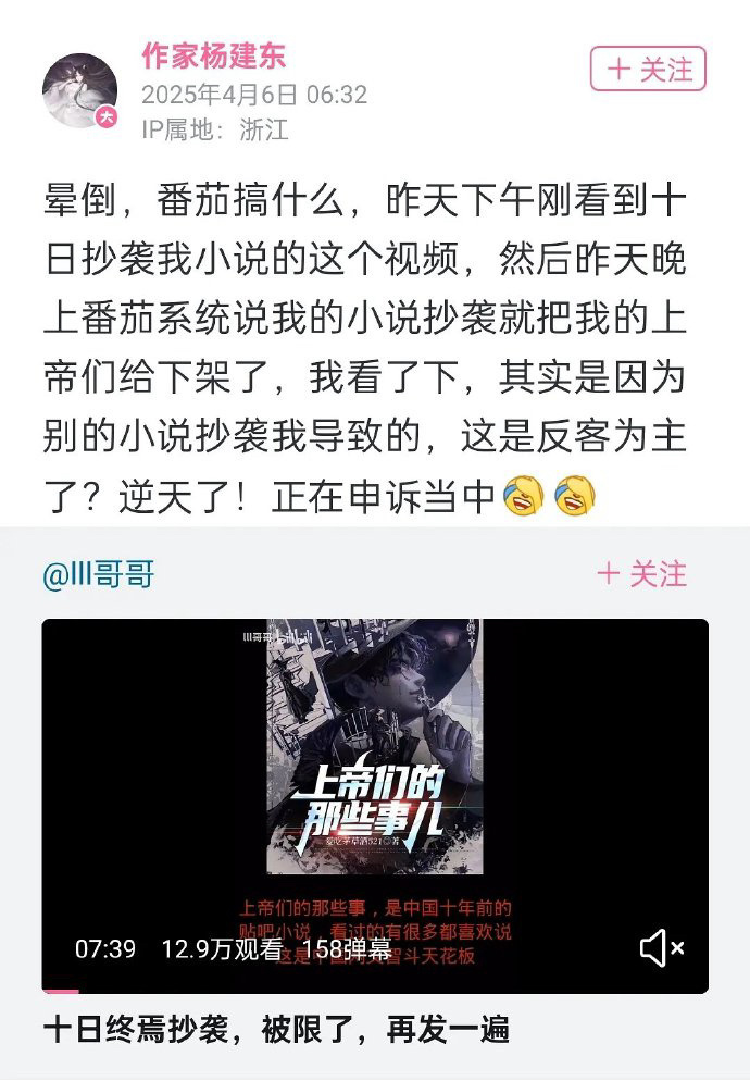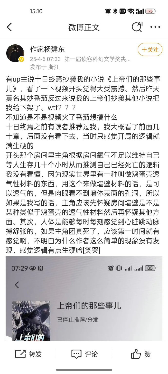 这几天jj 的事情闹的厉害,又有人重提了十日终焉小说抄袭的瓜了,真抄袭了吗?网友说不止抄袭还有虐♀辱♀情节,这对吗?其实很多所谓ip都是平台推的,正炒反炒给炒起来的。🍅之前一直被说小白文免费文,没有好书做不长久,所以每隔一段时间就推出一本爆款来,人造IP…很多经不起推敲的