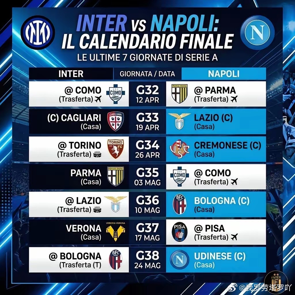 国际米兰 国际米兰的剩余赛程安排中,有4场比赛与那不勒斯的对手完全相同,另有3场则颇为相似。如今,意甲冠军的归属已牢牢掌握在国际米兰自己手中!在接下来的意甲联赛剩余7轮较量中,国际米兰与那不勒斯都将先后迎战拉齐奥、博洛尼亚、科莫以及帕尔马这四支劲旅。除此之外,国际米兰还将与为保级而战的卡利亚里展开对决,而那不勒斯则要面对同样在保级边缘挣扎的克雷莫纳。在另外两场比赛中,国际米兰的对手是已确定降级的维罗纳,那不勒斯则将与同样无缘季后赛的比萨一较高下。最后,国际米兰将与中游球队都灵展开较量,而那不勒斯的对手则是同样处于中游、无缘季后赛的乌迪内斯(需说明的是,图中球队标志存在错误)。目前,两队都还剩7场比赛要打,且积分差距仅为7分,赛程难度其实相差无几。接下来的比赛,就全看齐沃以及国际米兰全体球员的发挥了。