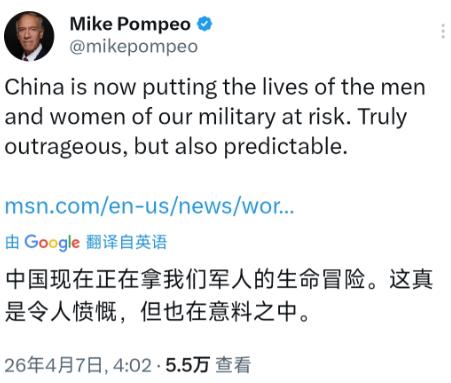 美国前国务卿蓬佩奥今天(北京时间4月7日)发文写道,中国现在正在拿我们军人的生命冒险。这真是令人愤慨,但也在意料之中。 说白了,蓬佩奥这句 “拿军人生命冒险” 的指控,不过是美国霸权体系里又一场熟练的 “甩锅秀”,背后是美国两党与政客长期固化的对华遏制路线,以及西方选举政治中拿中国当 “上位跳板” 的恶劣生态。 美国前国务卿蓬佩奥今天发文写道:“中国现在正在拿我们军人的生命冒险。这真是令人愤慨,但也在意料之中。” 这话听着是不是挺吓人?但仔细一琢磨,全是漏洞,蓬佩奥转发的 MSN 新闻毫无实据地污蔑中国 AI 私企帮伊朗定位美军设施,可据我了解,美国才是全球最大的军事存在,常年在世界各地驻军,把士兵当霸权扩张的棋子,亲手把他们置于危险境地。 现在局势失控了,就倒打一耙,把自己战略失误的锅甩给中国,这操作太熟练了。 这事往深了说,根本不是个人言行,而是美国一套长期的 “流水线作业”,我感觉不管谁当总统,不管换哪个部门的人,对华策略基本都绕不开那套:打击、攻击、破坏、围堵。 民主党也好,共和党也罢,嘴上说得天花乱坠,核心都是把中国当 “主要对手”,这已经是两党的基本共识了,别说总统了,就连普通议员想竞选成功,不拿中国说事都难。 而且我觉得西方政要想上位,都拿中国说事,这可不是好现象,我们要予以反制维护国家形象,你看,竞选时喊几句 “对华强硬”,既能转移国内选民对通胀、失业的注意力,又能拉到军工、科技利益集团的选票,一举两得。 久而久之,对华强硬就成了政治正确,谁敢软一点,就被贴上 “软弱” 的标签,这对中美关系可不是好事。 再说说特朗普,这人的双标真是刻在骨子里,他炸人家的时候,说是 “为了和平”;换别人炸他,立马扣 “恐怖袭击” 的帽子,这不是赤裸裸的强盗逻辑吗? 据我观察,他任内对伊朗放狠话,威胁要把对方 “炸回石器时代”,连国际法专家都看不下去,联名警告这可能构成战争罪,可到了他自己这儿,就成了 “维护和平”,标准全凭他一张嘴。 要我说,中国再坚持 10 年,年轻人全面崛起,真的没美国人什么事了,这话听着解气,但也是事实,现在中国的年轻人,在科技、制造、创新领域越来越能打,华为、大疆这些企业在全球都有一席之地。 再过 10 年,等这代年轻人全面成长为各行各业的中坚力量,中国的竞争力只会更强,美国与其天天搞围堵、制裁,不如花点心思解决自己的产业空心化、社会撕裂问题,不然再怎么甩锅,也挡不住崛起的趋势。 蓬佩奥这番话,说到底还是美国霸权心态的体现,自己在全球搞事,把军人置于险境,却怪别人 “冒险”,而美国政客拿中国说事的套路,西方选举政治的双标,以及中国年轻人崛起的大势,这些都是长期存在的现实,我们既要看清这些套路,也要保持定力,用发展回应抹黑。 以上仅为个人看法,欢迎留言讨论。
