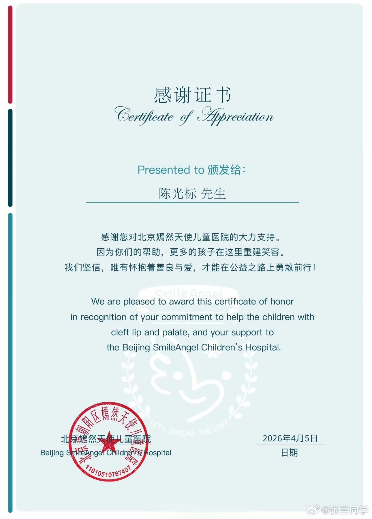 嫣然医院发感谢证书感谢陈光标捐赠1000万元