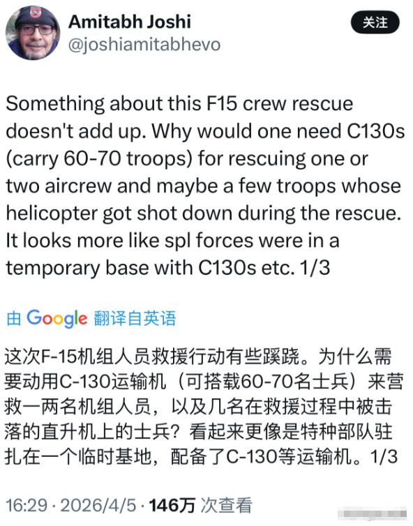 美军成功营救飞行员后,有个问题越想越不对劲,总感觉美国在掩盖什么! 众所周知,一架C-130运输机能运送60-70人,两架就是120-140人,这与外媒报道的动用上百名特种士兵的消息基本吻合。但是美军需要救援的不是十几人、几十人,而是只有两人,这动静也太大了吧! 最近这段时间,美军深入伊朗境内救回坠机飞行员的事,在国际上闹得沸沸扬扬,就连特朗普都亲自出来高调喊话,说这是“美国历史上最大胆的搜救行动之一”,听着好像是美军又秀了一把特种作战的本事,可这事越往后琢磨,越让人觉得哪里不对,翻来覆去想,总感觉美国藏着掖着,根本没把这事的实情全说出来。 这事的来龙去脉其实不复杂,4月3号,那架F-15E被伊朗击落,两名飞行员弹射,前座很快获救,后座武器系统军官失联近48小时,靠着一把手枪和定位信标在山区躲藏。 伊朗革命卫队拉网搜捕,还发了悬赏,眼看就要抓到人,美军突然出手,100多名特种部队深入伊朗境内300公里,硬是把人抢了回来。 最让人起疑的就是这规模。两架C-130运输机装了100多号人,海豹6队为主力,三角洲和游骑兵当后备,天上还有155架各型飞机支援,包括4架轰炸机、64架战斗机、48架加油机,光炸弹就扔了上百枚。 救一个人用得着这么大阵仗?按美军标准搜救配置,一个12人小队加两架直升机足够,这次直接翻了10倍不止,简直是杀鸡用牛刀,不合常理。 更邪门的是装备损失。行动中两架MC-130运输机起落架陷在简易跑道里动弹不得,四架MH-6小鸟直升机也出了问题。美军最后干脆把这些价值数亿美元的装备全炸了,理由是“防止落入伊朗之手”。 这理由听着冠冕堂皇,可细想就不对劲——军用运输机和直升机上有多少机密技术?真要怕泄密,当初就不该让它们降落在伊朗境内的简易跑道上。 而且炸装备的决心这么大,倒像是在销毁什么见不得人的证据,怕伊朗拿到后查出更深的内幕。 还有时间点也卡得太巧。行动选在凌晨4点,说是利用“生理低谷期”趁伊朗人犯困下手。可为啥非要等48小时才动手?早干嘛去了?这48小时里,美军难道只是在制定计划?还是在等什么信号? 更诡异的是,行动一结束,美军就立刻炸毁了所有故障装备,连个零件都没留下,这效率,比救人还高。 再说说伤亡数字。美军说自己零阵亡,只有几名士兵受伤,伊朗方面4死多伤。可伊朗革命卫队却宣称击落了美军1架A-10攻击机、2架C-130运输机、4架黑鹰和2架小鸟直升机,还有2架MQ-9无人机。 双方说法差这么多,到底谁在撒谎?美军如果真没那么大损失,为啥要急着炸装备?这不就等于承认自己有重大损失,还怕被抓现行吗? 最关键的是任务性质。F-15E到底去伊朗境内干嘛?美军只说是“执行任务”,具体什么任务绝口不提。按常理,战斗机不会无缘无故深入他国领空,尤其是伊朗这种敌对国家。 有个细节特别耐人寻味。美军为了这次营救,居然在48小时内紧急修建了一条简易跑道,这工程能力确实强,但也暴露了问题——他们对这个区域的地形和环境熟悉得过分,不像是临时准备的,倒像是早就踩好点,就等着这一天用。 还有以色列的角色。有消息说以色列提供了情报支持,甚至可能出动了战机配合轰炸。以色列和伊朗是死对头,他们掺和进来,这事的性质就变了,不再是单纯的营救,更像是一次联合军事行动。 这就让人不得不联想,美军是不是在掩盖任务真相?F-15E上的武器系统军官,掌握着多少核心机密?如果被伊朗活捉,会不会把美军在中东的军事部署、行动计划、甚至和以色列的秘密合作都供出来? 这恐怕才是美军不惜一切代价也要救人,还要销毁装备的真正原因。他们怕的不是飞行员被俘,而是怕飞行员被俘后,把不该说的都说了,那损失可就不是几架飞机能比的了。 特朗普高调宣布成功,更像是在转移视线。他需要一场“胜利”来提振支持率,尤其是在大选临近的时候。 可这场“胜利”背后,是美军在伊朗境内的非法入侵,是数亿美元装备的损失,还有可能是一个被掩盖的军事秘密。 这事越想越觉得蹊跷。美军救人是真,但为啥救人、救的人知道多少秘密、行动中到底损失了什么,这些才是真正的关键,而这些恰恰是美军绝口不提的部分。炸装备、夸大难度、模糊任务性质,种种操作都指向一个结论——美军在掩盖一个比营救行动本身重要得多的秘密。
