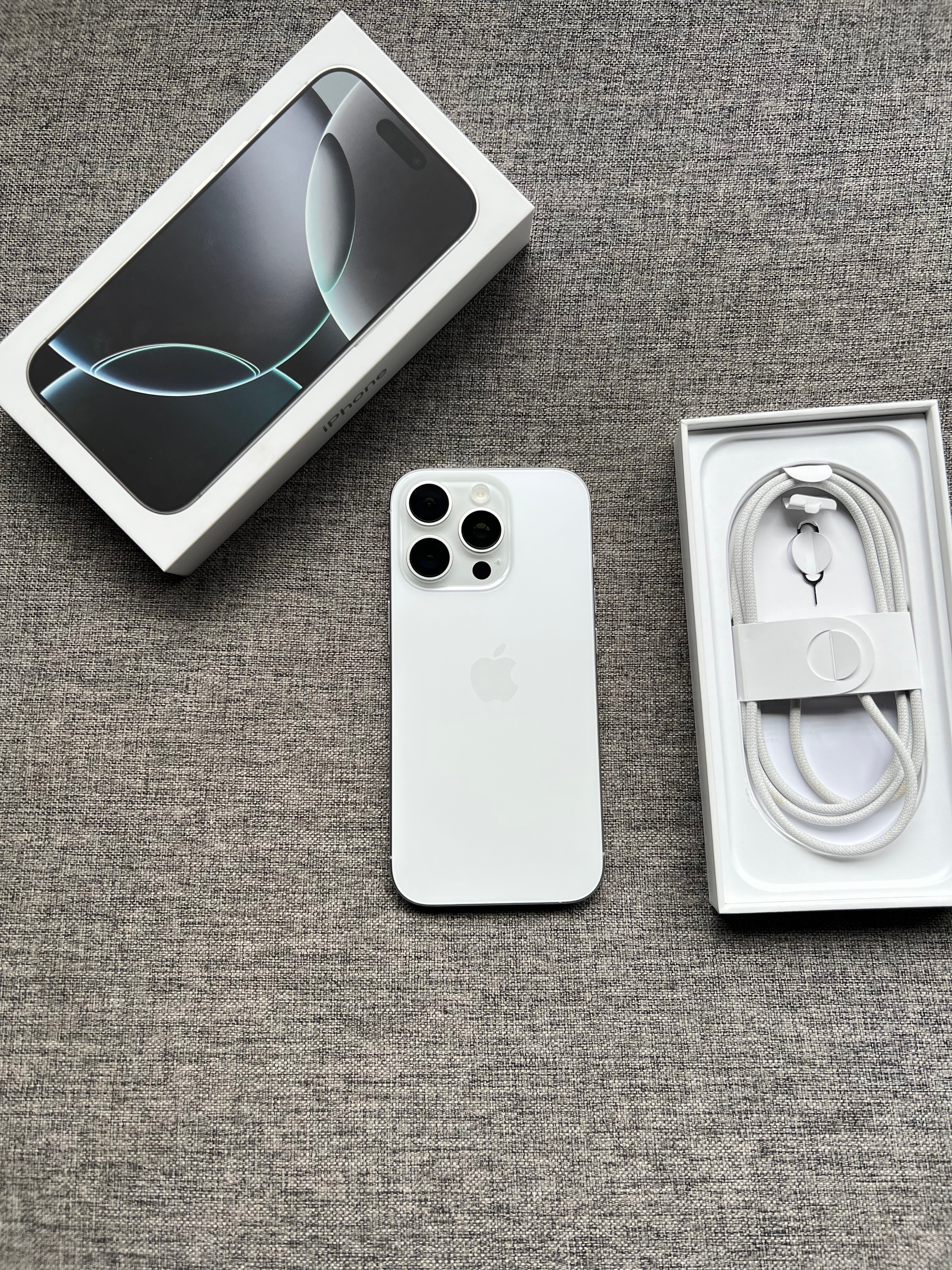 iPhone16 Pro 256G 白色,屏幕完美,中框小划痕,🔋效率92,盒子配件全套,店保三个月非人为损坏。5999
