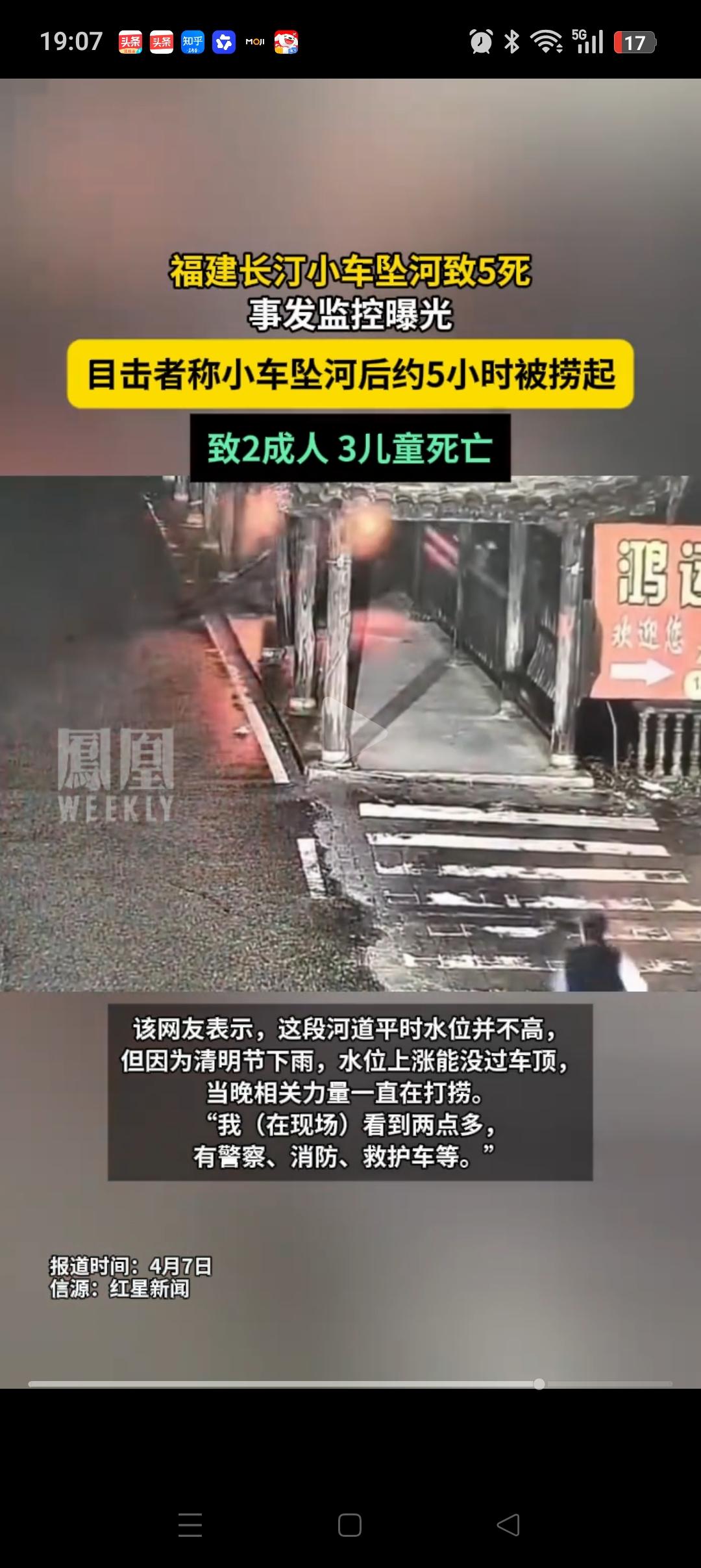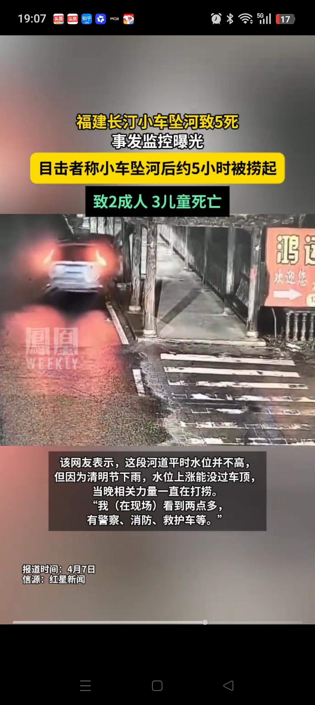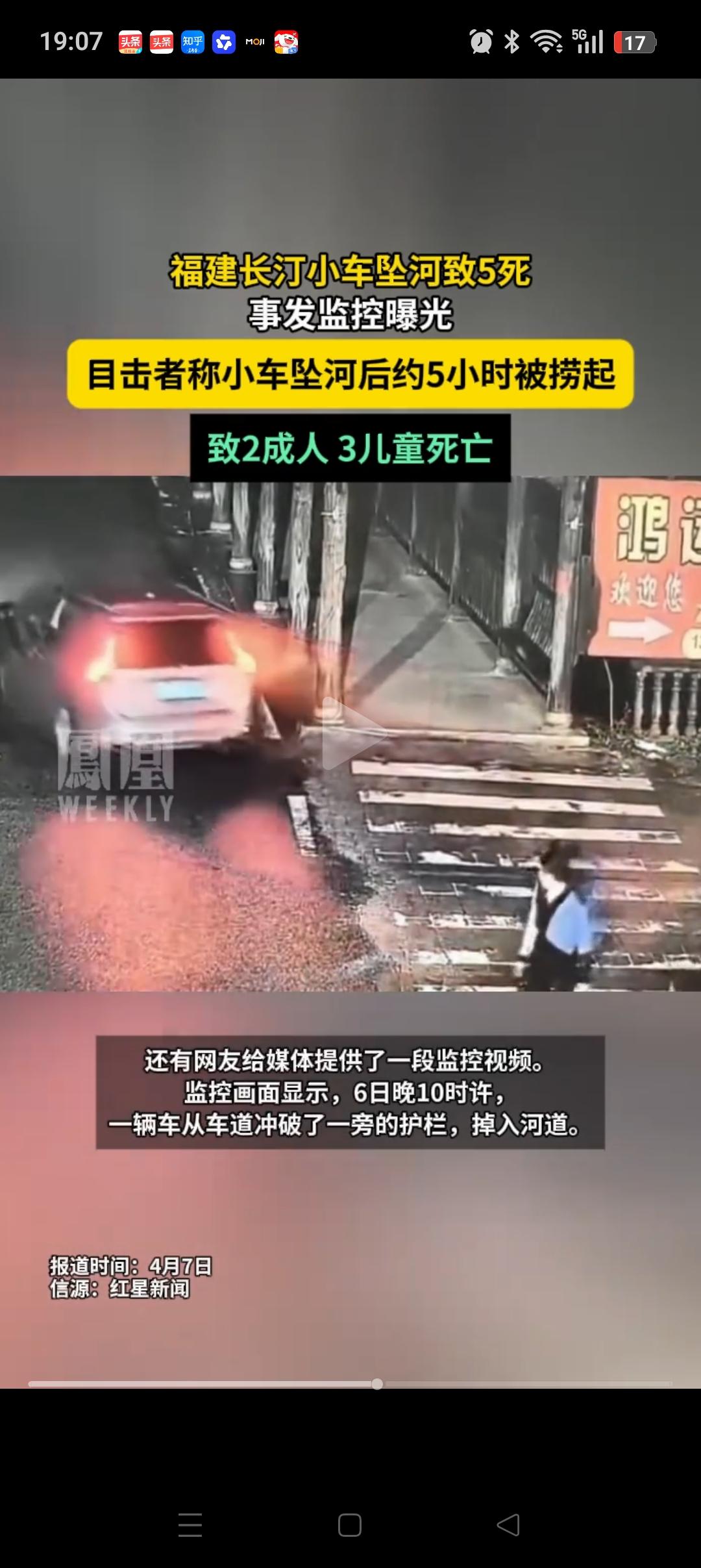福建长汀一车辆坠河,真的看不懂!明明车辆只是刚刚起步,且拐弯不需要太大,怎么就突然打了那么大一个方向,直接撞上了河边的亭子,就这么冲了下去。 从视频里可以看到,是一位女司机开的车,年龄大概40岁左右。估计也不是第一次开车了,怎么会出现这么大的失误呢! 还有一个细节,就是几个路人在车子刚刚起步时,一直看着车子。所以很多网友都觉得或许里面有人吵架。 但我仔细想了想,应该是认识的朋友,吃完后想目送他们离开。因为从车辆坠河一瞬间他们的反应就可以看出来。(一般的路人不可能马上追上去查看,看得出来他们很关心) 车上当时有5个人,3个小孩,2个大人。那个坐在副驾驶的大人,怎么没反应过来打一把方向呢! 真的好可惜[祈祷][祈祷]