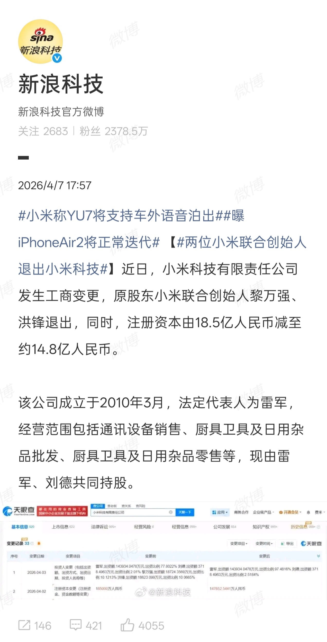 两位小米联合创始人退出小米科技其实黎总和洪帮主早就是我米的退休老将了,已经很多年没有参与公司的实质运营,退休老股东正常退出没啥值得大惊小怪的,各种过度解读更是没啥必要...
