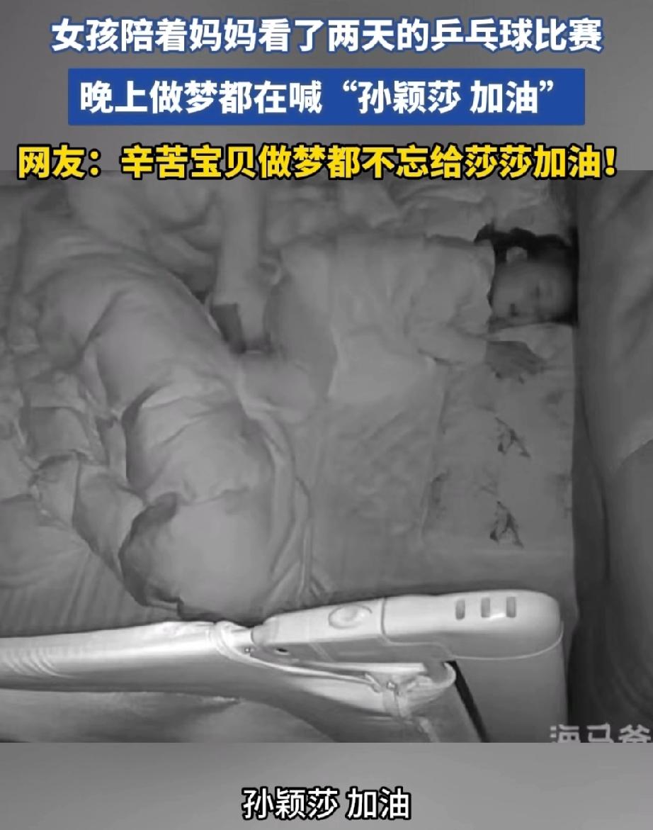 天哪! 真爱呀。 七八岁孩子陪着妈妈看乒乓球比赛,连续两天看的太累了。睡着做梦都