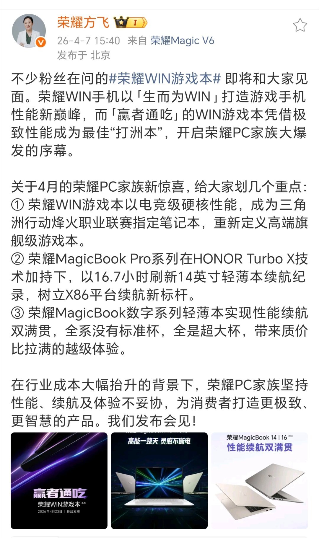特别是WIN系列被称为最佳打洲本。根据之前的网上爆料,荣耀WIN游戏本应该有两个版本。标准版配备i7-14650HX+RTX 5060,覆盖主流游戏玩家的需求。顶配版搭载英特尔Ultra 9 290HX Plus处理器与RTX 5070显卡,整机性能释放突破250W,配有360W充电头。性能夯爆了。荣耀官宣WIN游戏本定档4月23日