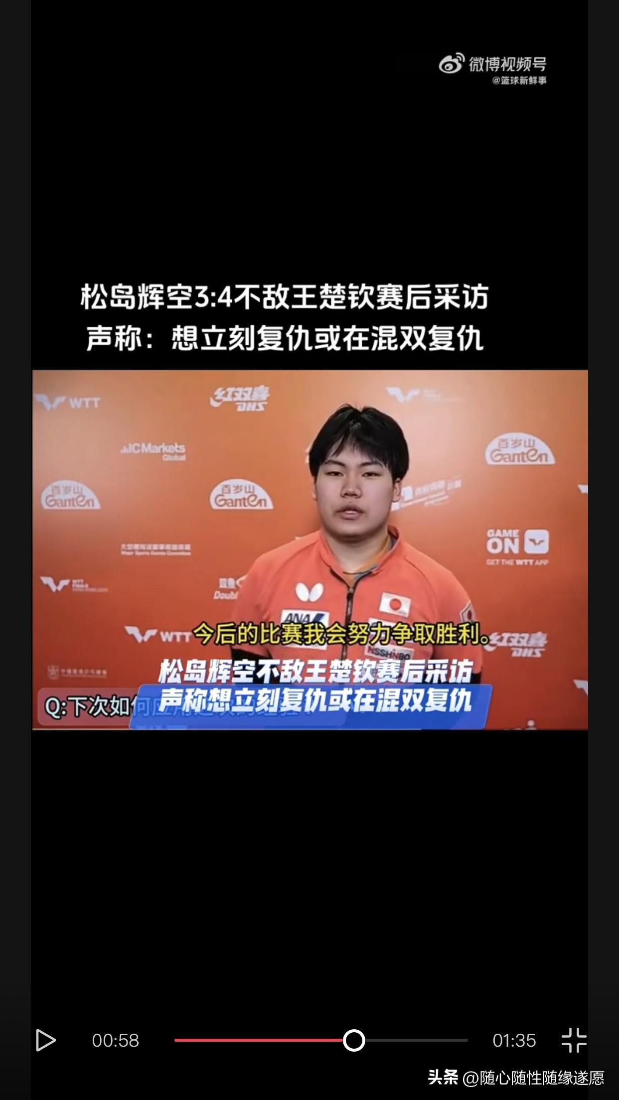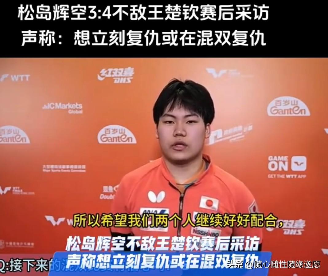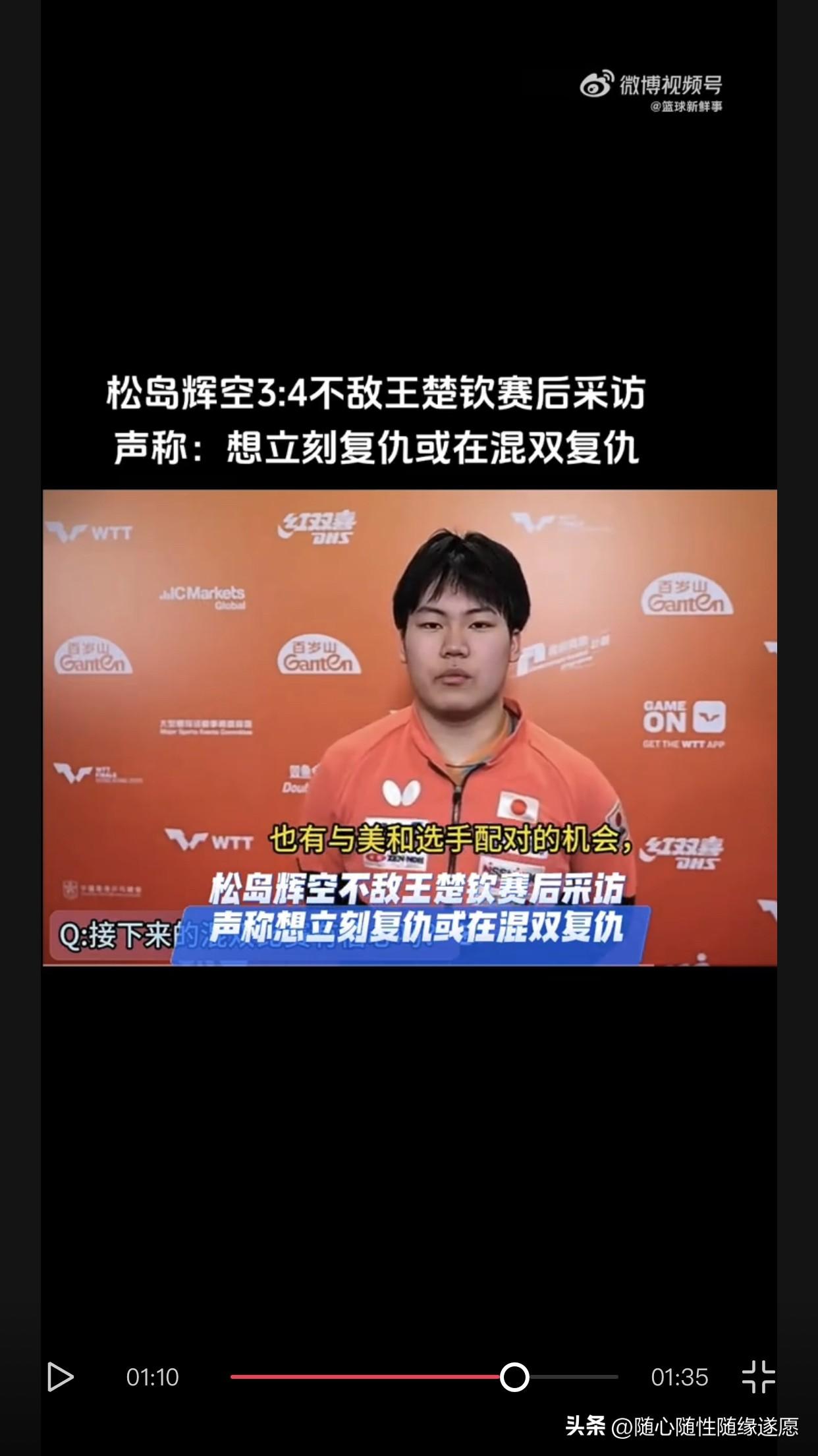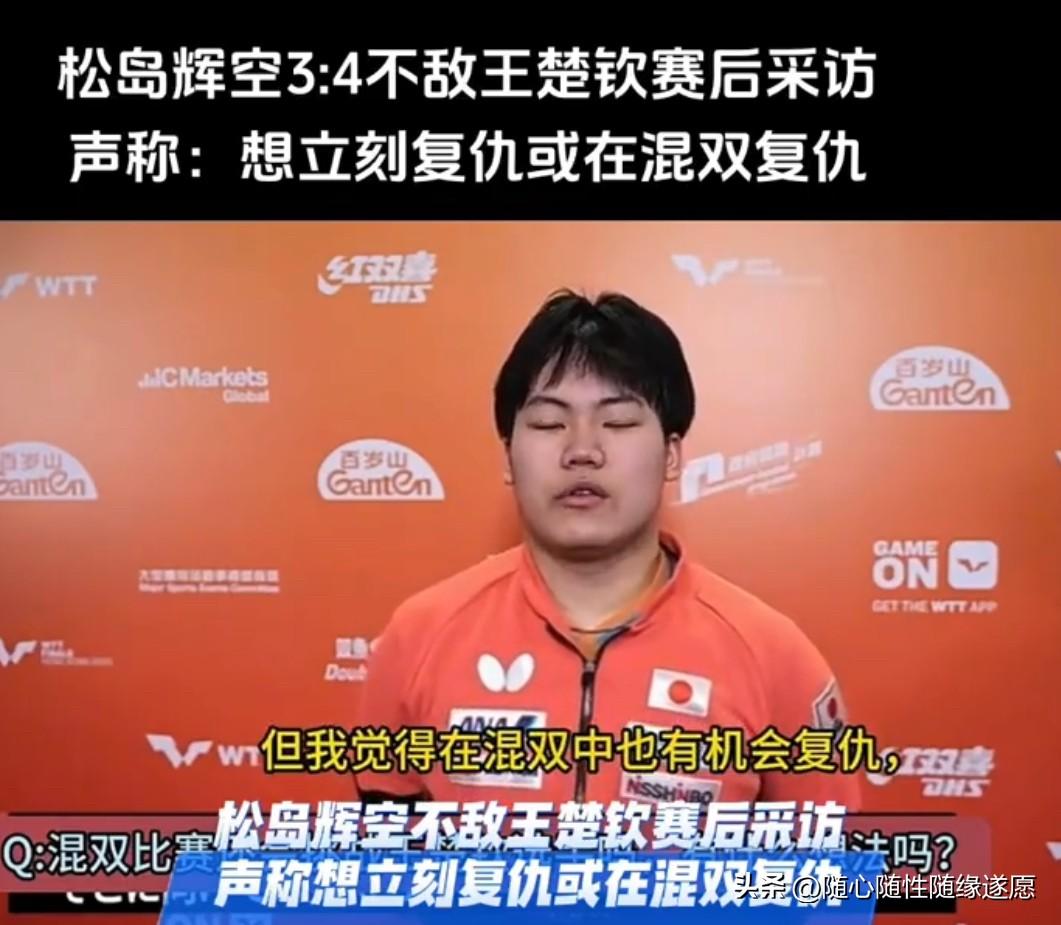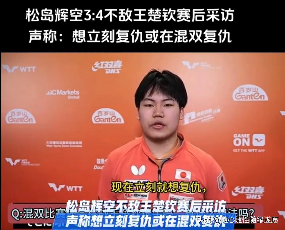 松岛辉空又被王楚钦打哭了! 松岛辉空: 只有一句话,我很懊悔! 现在立刻就想复仇, 与美和也有配合混双的机会, 希望我们两个好好配合, 混双中也有复仇! 今后在比赛中会努力争取胜利! 松岛辉空“懊悔”还有“不服气”可以理解,但是,想赢单打和混双,在中国队面前谈“复仇”,怕还是有些痴心妄想! 不过,小小年纪的松岛辉空有那份冲劲,那份不服输的决心值得赞赏! 希望国乒队的小将们,能从松岛辉空的谈话中吸取什么吧!